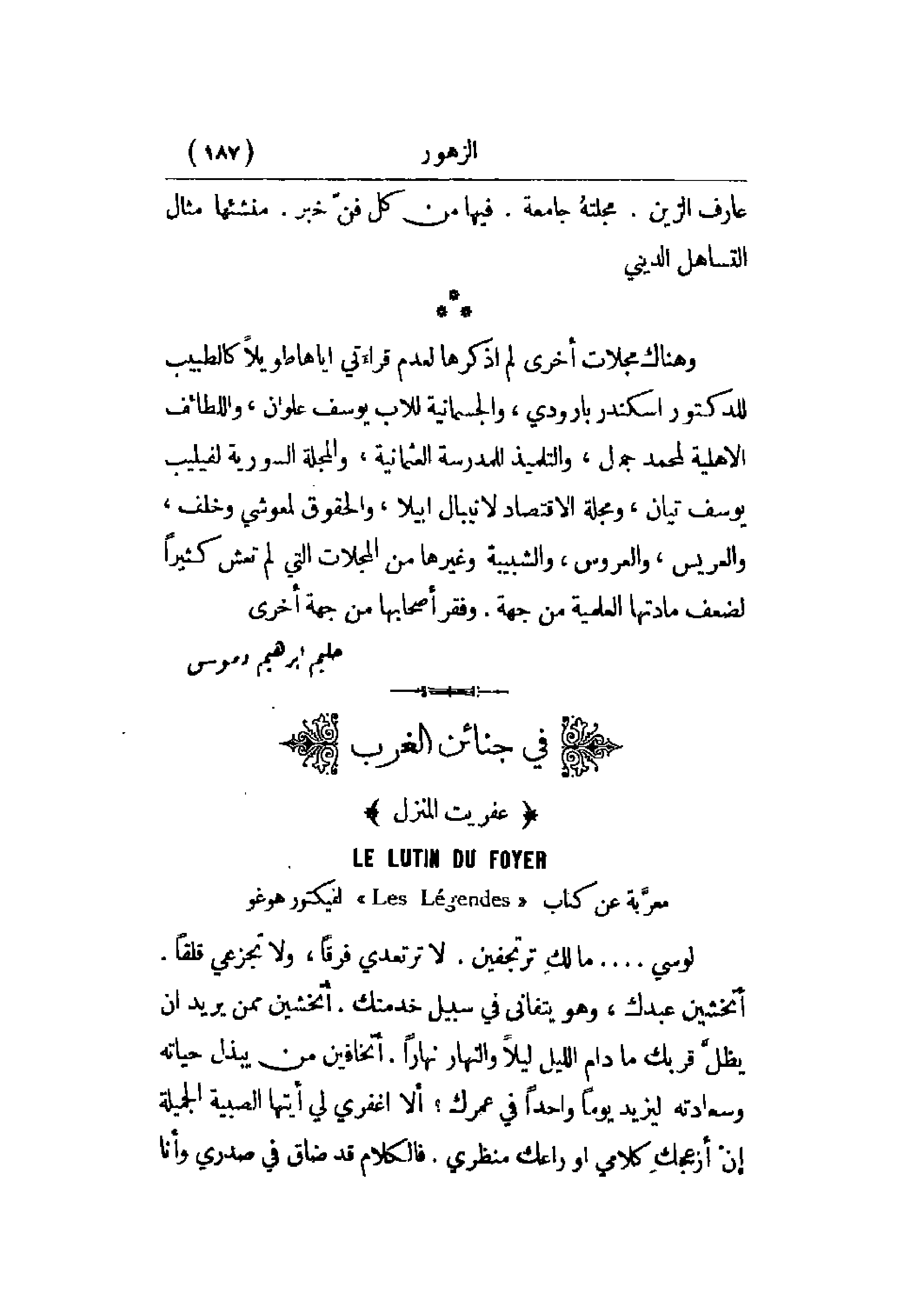وهناك مجلات أخرى لم أذكرها لعدم قراءتي إياها طويلاً كالطبيب للدكتور إسكندر بارودي، والجسمانية للأب يوسف علوان، واللطائف الأهلية لمحمد جمل، والتلميذ للمدرسة العثمانية، والمجلة السورية لفيليب يوسف تيان، ومجلة الاقتصاد لأنيبال إبيلا، والحقوق لمعوشي وخلف، والعري، والعروس، والشبيبة وغيرها من المجلات التي لم تعش كثيراً لضعف مادتها العلمية من جهة. وفقر أصحابها من جهة أخرى.