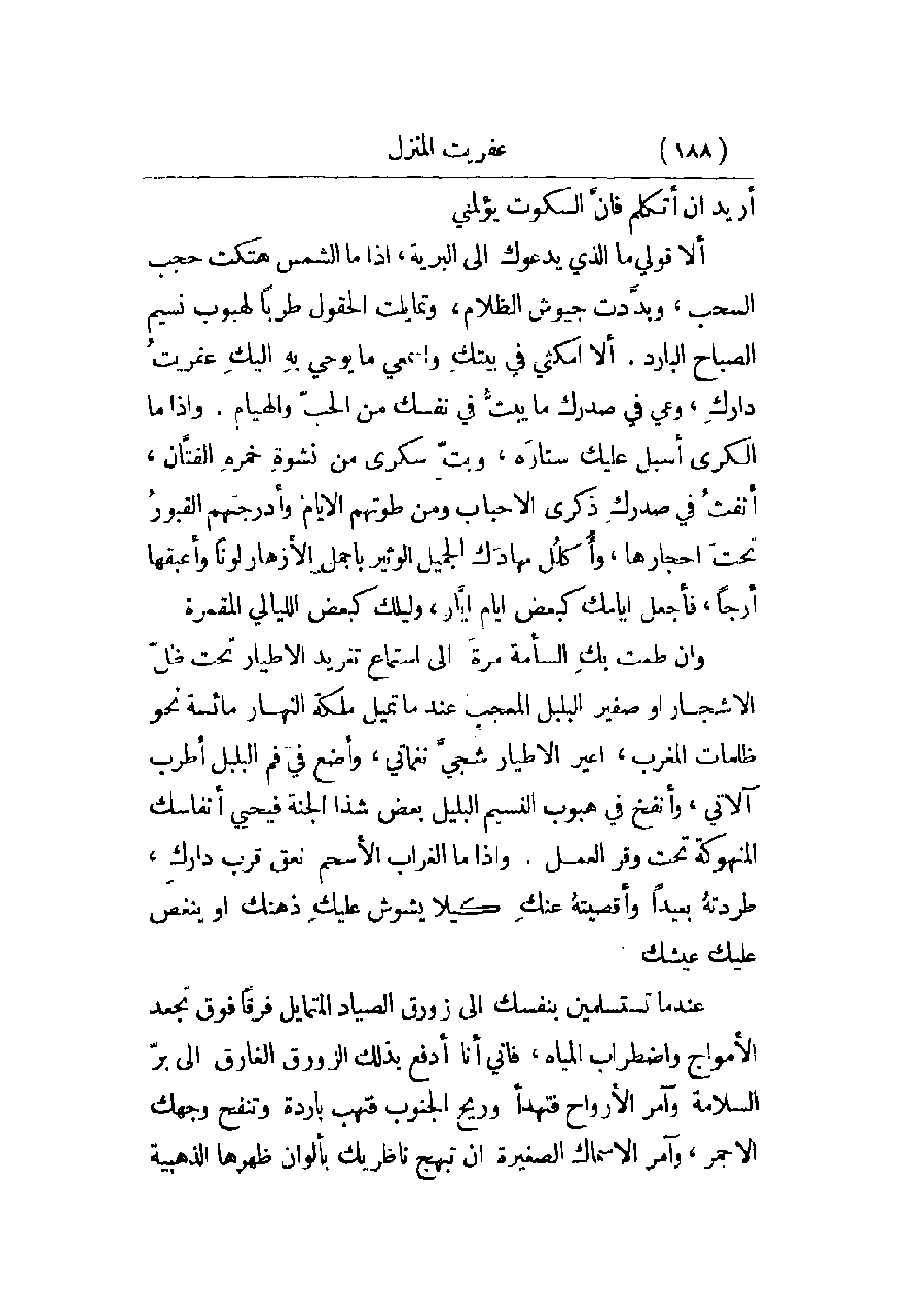 ألا قولي ما الذي يدعوك إلى البرية، إذا ما الشمس هتكت حجب السحب، وبددت جيوش الظلام، وتمايلت الحقول طرباً لهبوب نسيم الصباح البارد. ألا أمكثي في بيتك واسمعي ما يوحي به إليك عفريت دارك، وعي في صدرك ما يبث في نفسك من الحب والهيام. وإذا ما الكرى أسبل عليك ستاره، وبت سكرى من نشوة خمره الفتان. أنفث في صدرك ذكرى الأحباب ومن طوتهم الأيام وأدرجتهم القبور تحت أحجارها، وأكلل مهادك الجميل الوثير بأجمل الأزهار لوناً وأعبقها أرجاً. فأجعل أيامك كبعض أيام أيار، وليلك كبعض الليالي المقمرة.