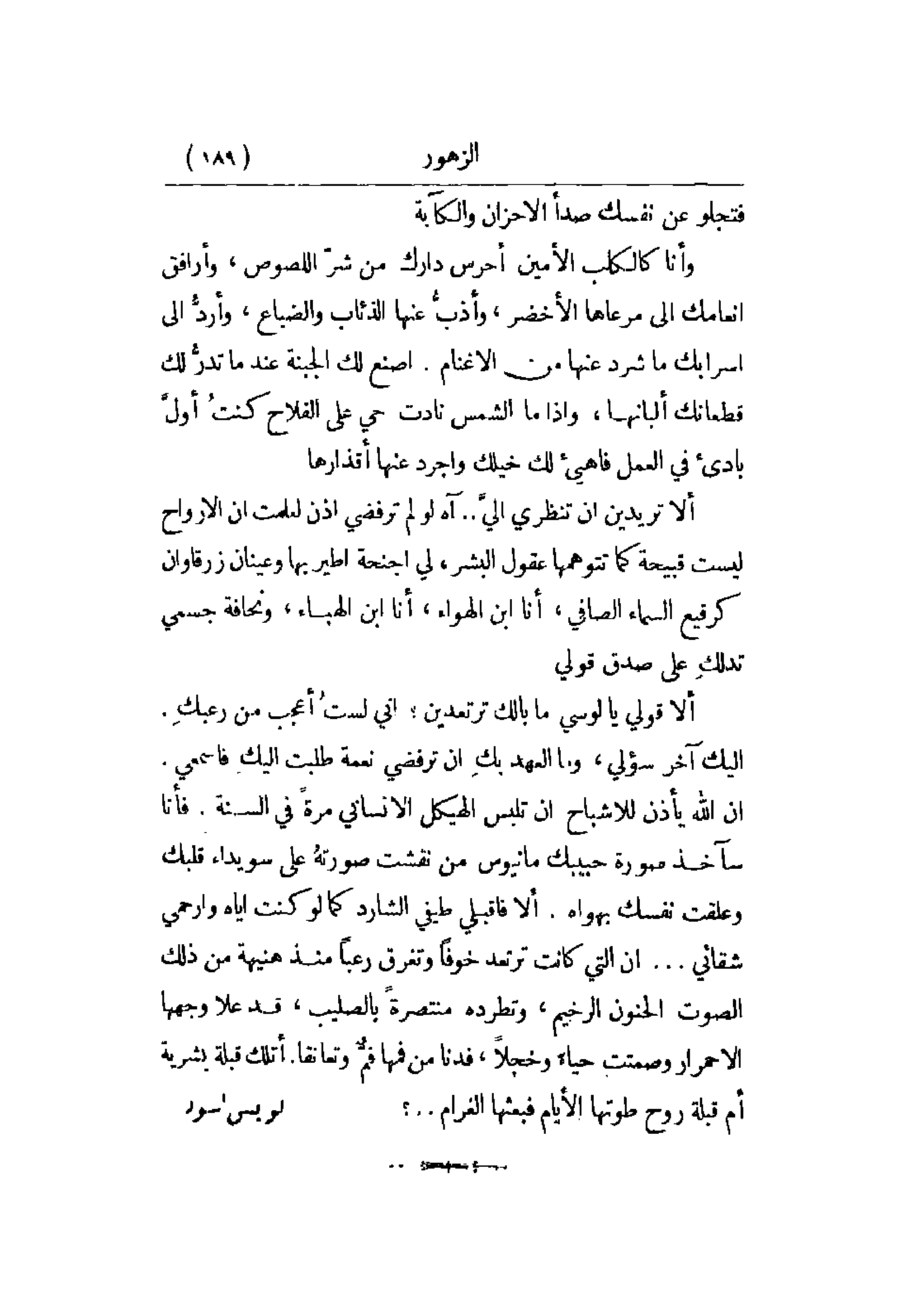 ألا قولي يا لوسي ما بالك ترتعدين؟ إني لست أعجب من رعبك. إليك آخر سؤلي، وما العهد بك أن ترفضي نعمة طلبت إليك فاسمعي. إن الله يأذن للأشباح أن تلبس الهيكل الإنساني مرة في السنة. فأنا سآخذ صورة حبيبك مانيوس من نقشت صورته على سويداء قلبك وعلقت نفسك بهواه. ألا فاقبلي طيفي الشارد كما لو كنت إياه وارحمي شقائي. . . إن التي كانت ترتعد خوفاً وتغرق رعباً منذ هنيهة من ذلك الصوت الحنون الرخيم، وتطرده منتصرة بالصليب، قد علا وجهها الأحمر وصمتت حياءً وخجلاً، فدنا من فمها فمٌّ وتعانقا. أتلك قبلة بشرية أم قبلة روح طوتها الأيام فبعثها الغرام. . .؟