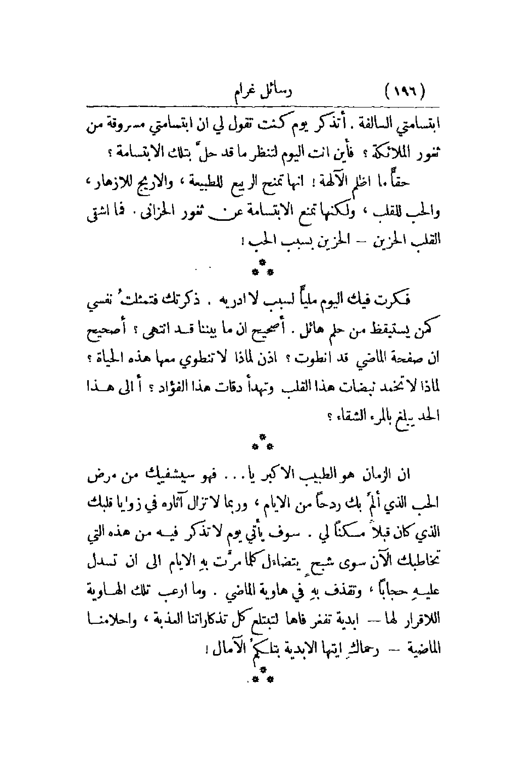 إن الزمان هو الطبيب الأكبر يا. . . . هو سيشفيك من مرض الحب الذي ألم بك ردحاً من الأيام، وربما لا تزال آثاره في زوايا قلبك الذي كان قبلاً مسكناً لي. سوف يأتي يوم لا تذكر فيه من هذه التي تخاطبك الآن سوى شبح يتضاءل كلما مرت به الأيام إلى أن تسدل عليه حجاباً، وتقذف به في هاوية الماضي. وما أعرب تلك الهاوية اللاقرار لها - أبدية تفغر فاهاً لتبتلع كل تذكاراتنا العذبة، وأحلامنا الماضية - رحماك أيتها الأبدية بتلكم الآمال!