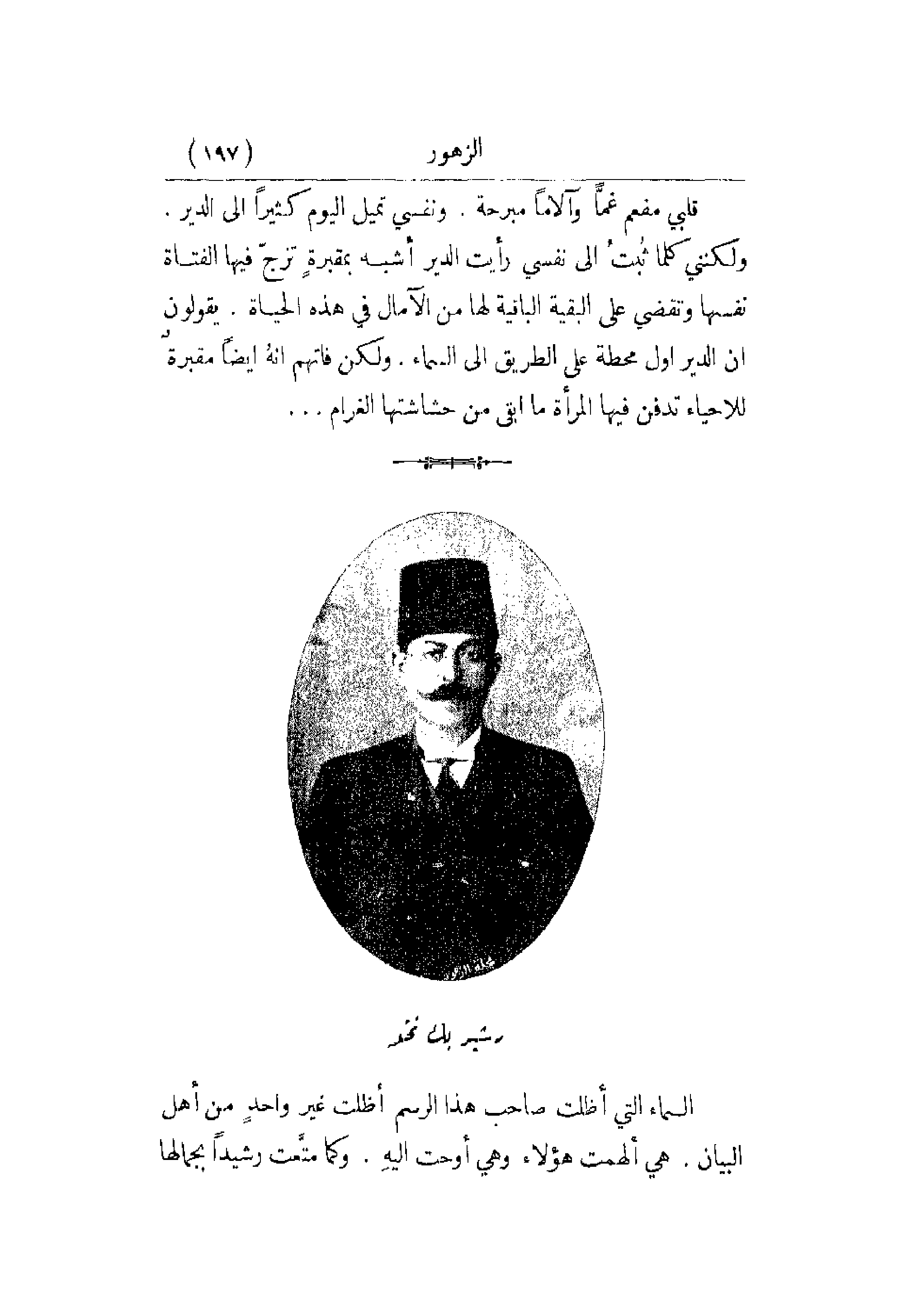 قلبي مفعم غماً وآلاماً مبرحة. ونفسي تميل اليوم كثيراً إلى الدير. ولكنني كلما ثبت إلى نفسي رأيت الدير أشبه بمقبرة تزج فيها الفتاة نفسها وتقضي على البقية الباقية لها من الآمال في هذه الحياة. يقولون إن الدير أول محطة على الطريق إلى السماء. ولكن فاتهم أنه أيضاً مقبرة للأحياء تدفن فيها المرأة ما أبقى من حشاشتها الغرام. . .