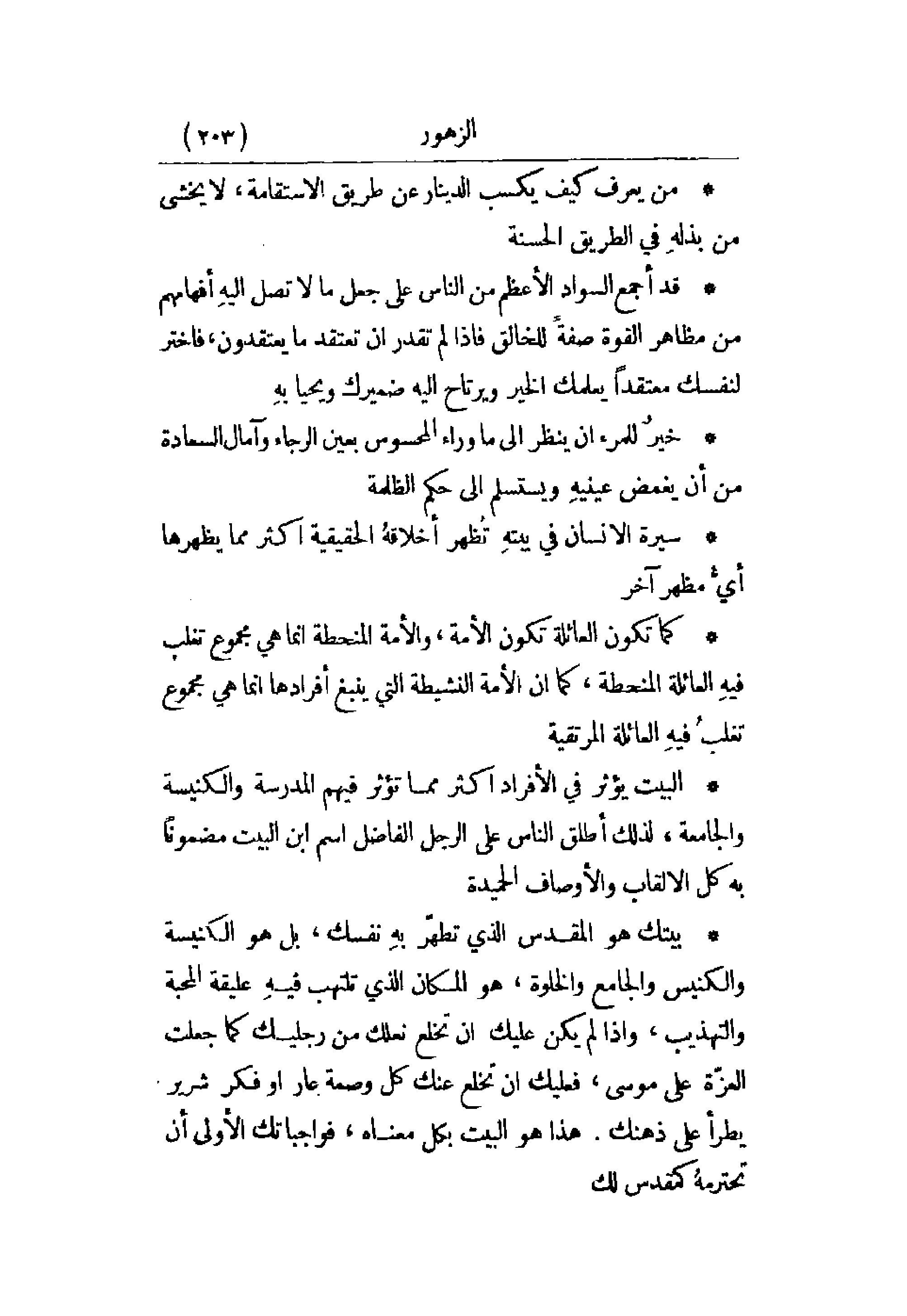 * بيتك هو المقدس الذي تطهر به نفسه، بل هو الكنيسة والكنيس والجامع والخلوة، وهو المكان الذي تلتهب فيه عليقة المحبة والتهذيب، وإذا لم يكن عليك أن تخلع نعلك من رجليك كما جعلت العزة على موسى، فعليك إن تخلع عنك كل وصمة عار أو فكر شرير يطرأ على ذهنك. هذا هو البيت بكل معناه، فواجباتك الأولى أن تحترمه كمقدس لك.