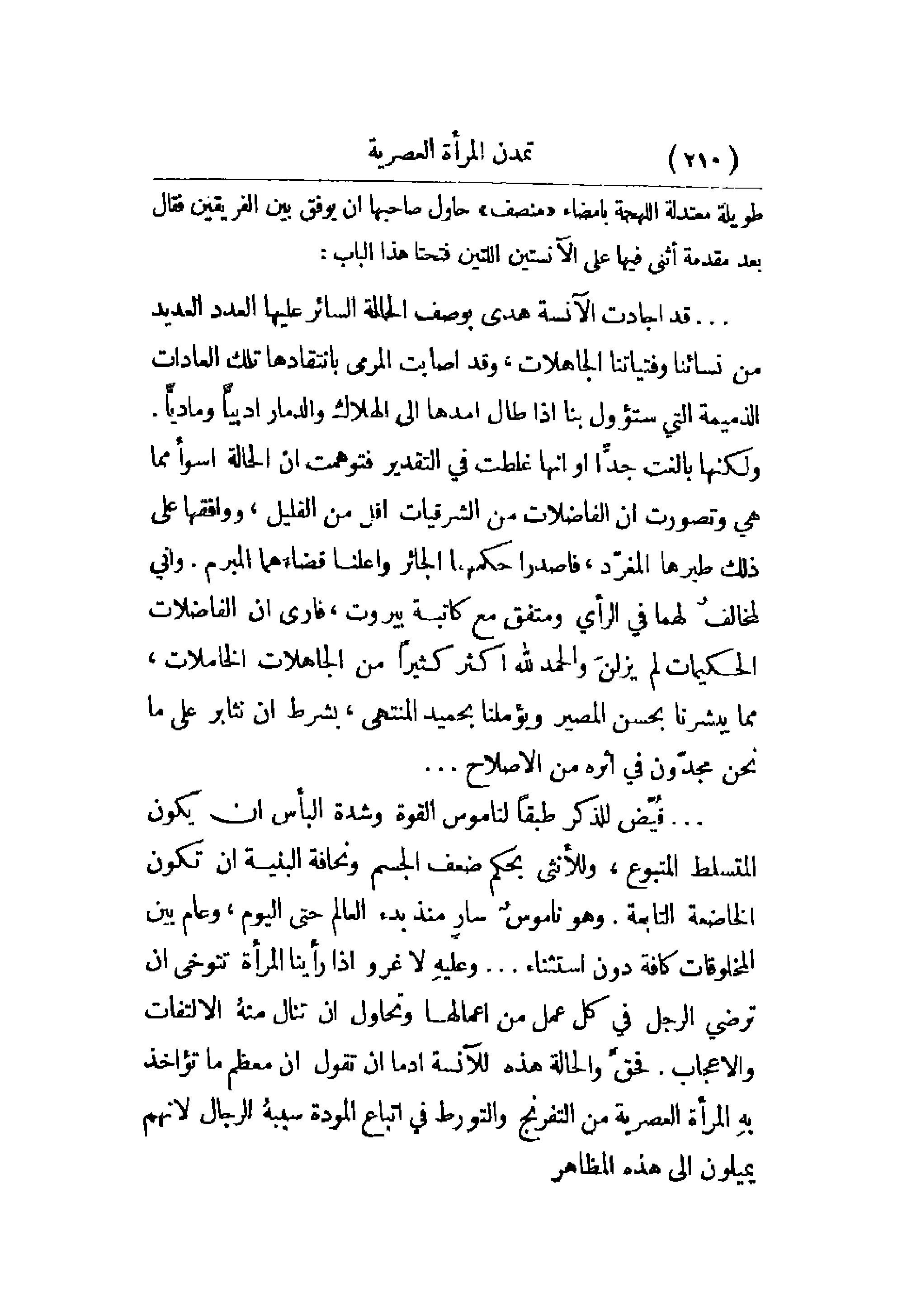 . . . . قُيّض للذكر طبقاً لناموس القوة وشدة البأس أن يكون المتسلط المتبوع، وللأنثى بحكم ضعف الجسم ونحافة البنية أن تكون الخاضعة التابعة. وهو ناموس سارٍ منذ بدء العالم حتى اليوم، وعام بين المخلوقات كافة دون استثناء. . . وعليه لا غرو إذا رأينا المرأة تتوخى أن ترضي الرجل في كل عمل من أعمالها وتحاول أن تنال منه الالتفات والإعجاب. فحق والحالة هذه للآنسة أدما أن تقول إن معظم ما تؤاخذ به المرأة العصرية من التفرنج والتورط في اتباع المودة سببه الرجال لأنهم يميلون إلى هذه المظاهر.