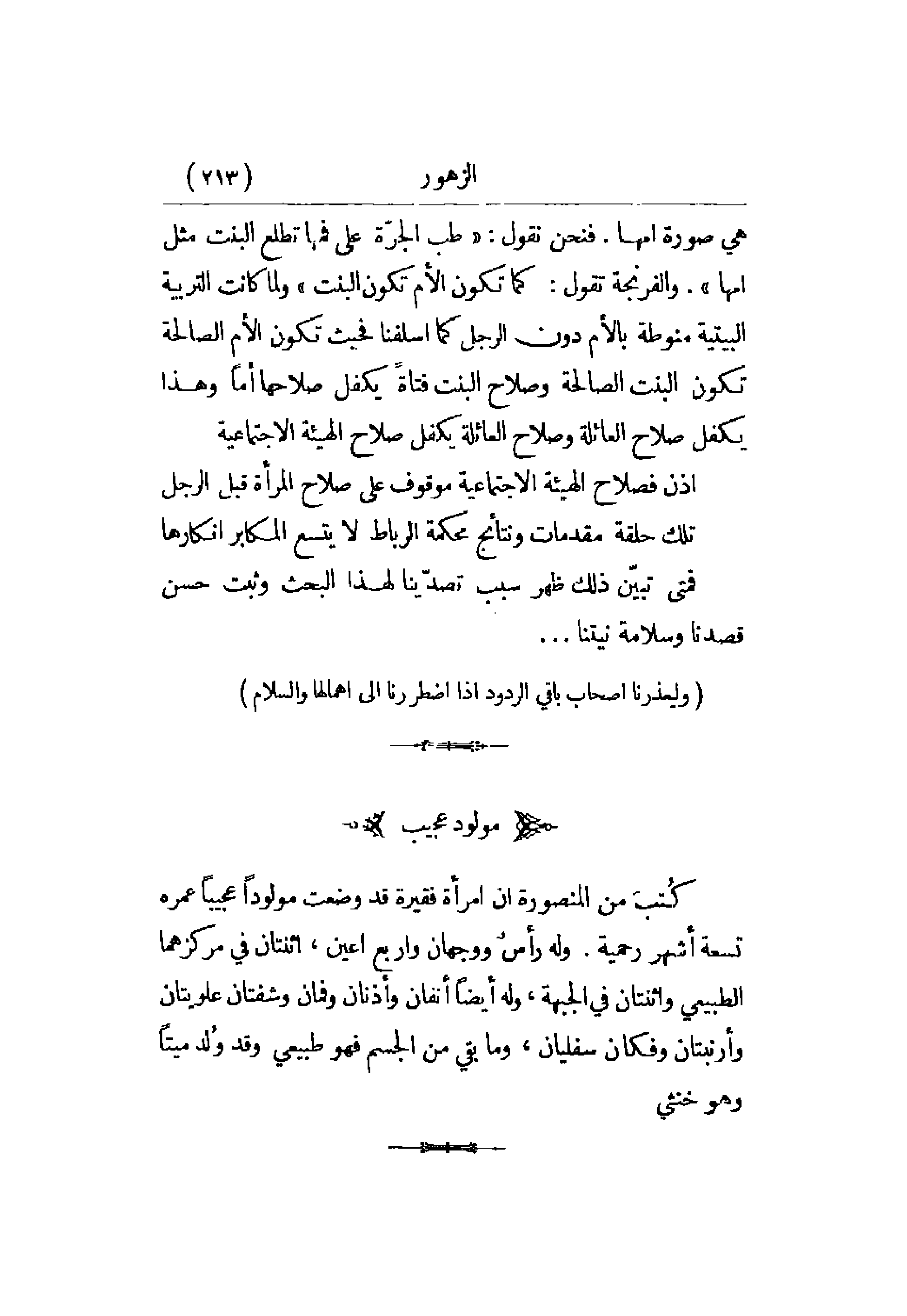 كتب من المنصورة أن امرأة فقيرة قد وضعت مولوداً عجيباً عمره تسعة أشهر رحمية. وله رأس ووجهان وأربع أعين. اثنتان في مركزهما الطبيعي واثنتان في الجبهة، وله أيضاً أنفان وأذنان وفمان وشفتان علويتان وأرنبتان وفكان سلفيان، وما بقي من الجسم فهو طبيعي وقد ولد ميتاً وهو خنثى.