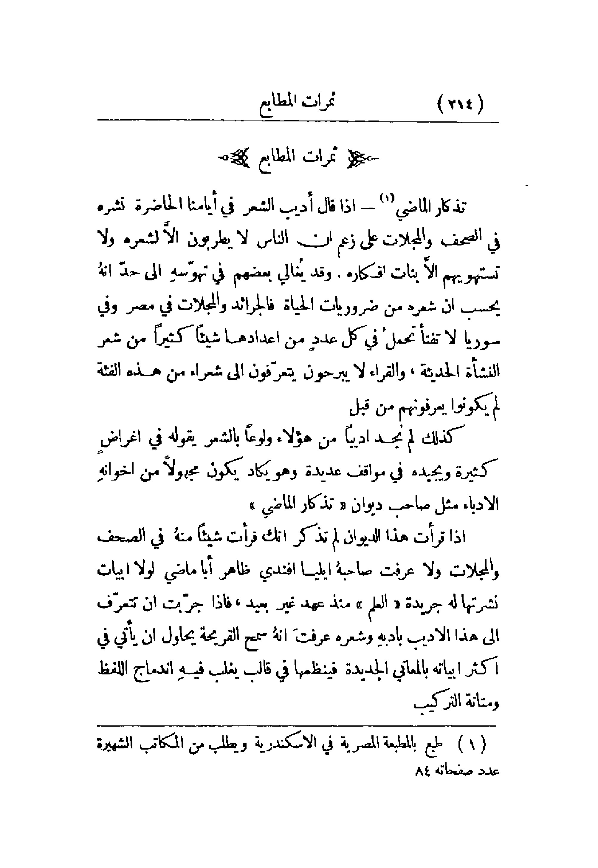 تذكار الماضي - إذا قال أديب الشعر في أيامنا الحاضرة نشره في الصحف والمجلات على زعم أن الناس لا يطربون إلا لشعره ولا تستهويهم إلا بنات أفكاره. وقد يغالي بعضهم في تهوسه إلى حد أنه يحسب أن شعره من ضروريات الحياة فالجرائد والمجلات في مصر وفي سورية لا تفتأ تحمل في كل عدد من أعدادها شيئاً كثيراً من شعر النشأة الحديثة، والقراء لا يبرحون يتعرفون إلى شعراء من هذه الفئة لم يكونوا يعرفونهم من قبل.