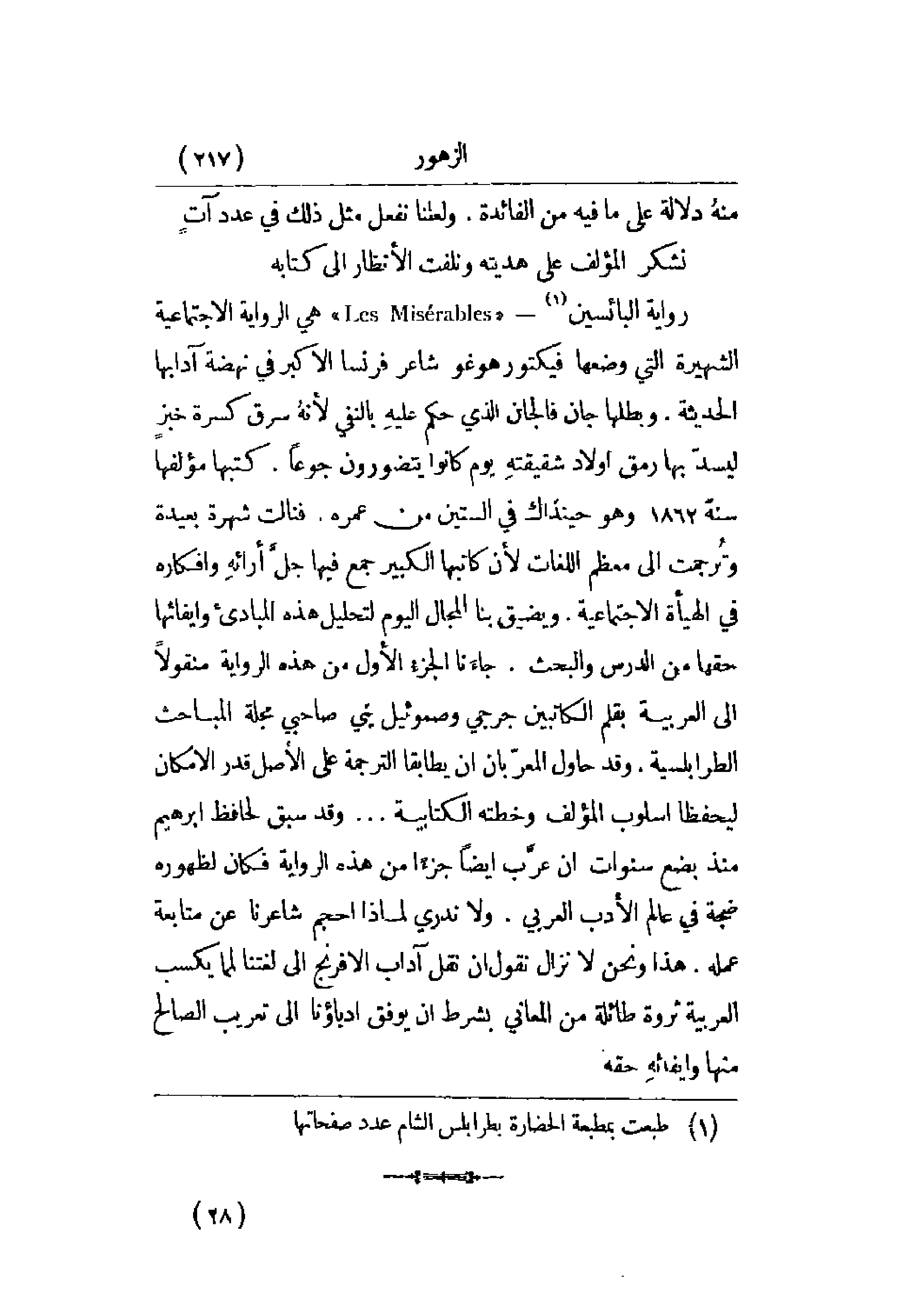 الرواية منقولاً إلى العربية بقلم الكاتبين جرجي وصموئيل يني صاحبي مجلة المباحث الطرابلسية. وقد حاول المعربان أن يطابقا الترجمة عل الأصل قدر الإمكان ليحفظا أسلوب المؤلف وخطته الكتابية. . . وقد سبق لحافظ إبراهيم منذ بضع سنوات أن عرب أيضاً جزءاً من هذه الرواية فكان لظهوره ضجة في عالم الأدب العربي. ولا ندري لماذا أحجم شاعرنا عن متابعة عمله. هذا ونحن لا نزال نقول إن نقل آداب الإفرنج إلى لغتنا لمما يكسب العربية ثروة طائلة من المعاني بشرط أن يوفق أدباؤنا إلى تعريب الصالح منها وإيفائه حقه.