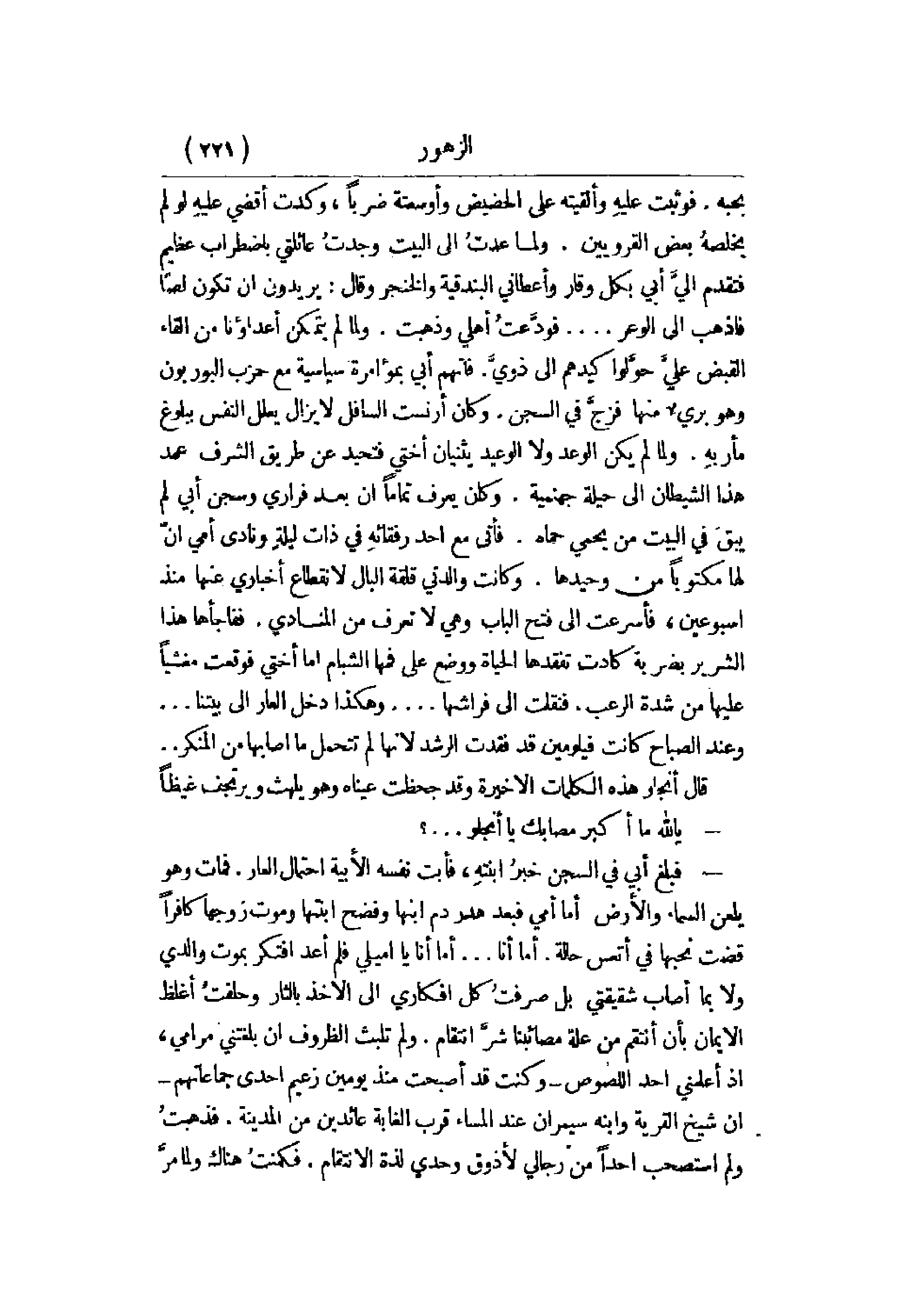 على فمها الشبام أما أختي فوقعت مشغياً عليها من شدة الرعب. فنقلت إلى فراشها. . . وهكذا دخل العار إلى بيتنا. . . وعند الصباح كانت فيلومين قد فقدت الرشد لأنها لم تتحمل ما أصابها من المنكر. . . .