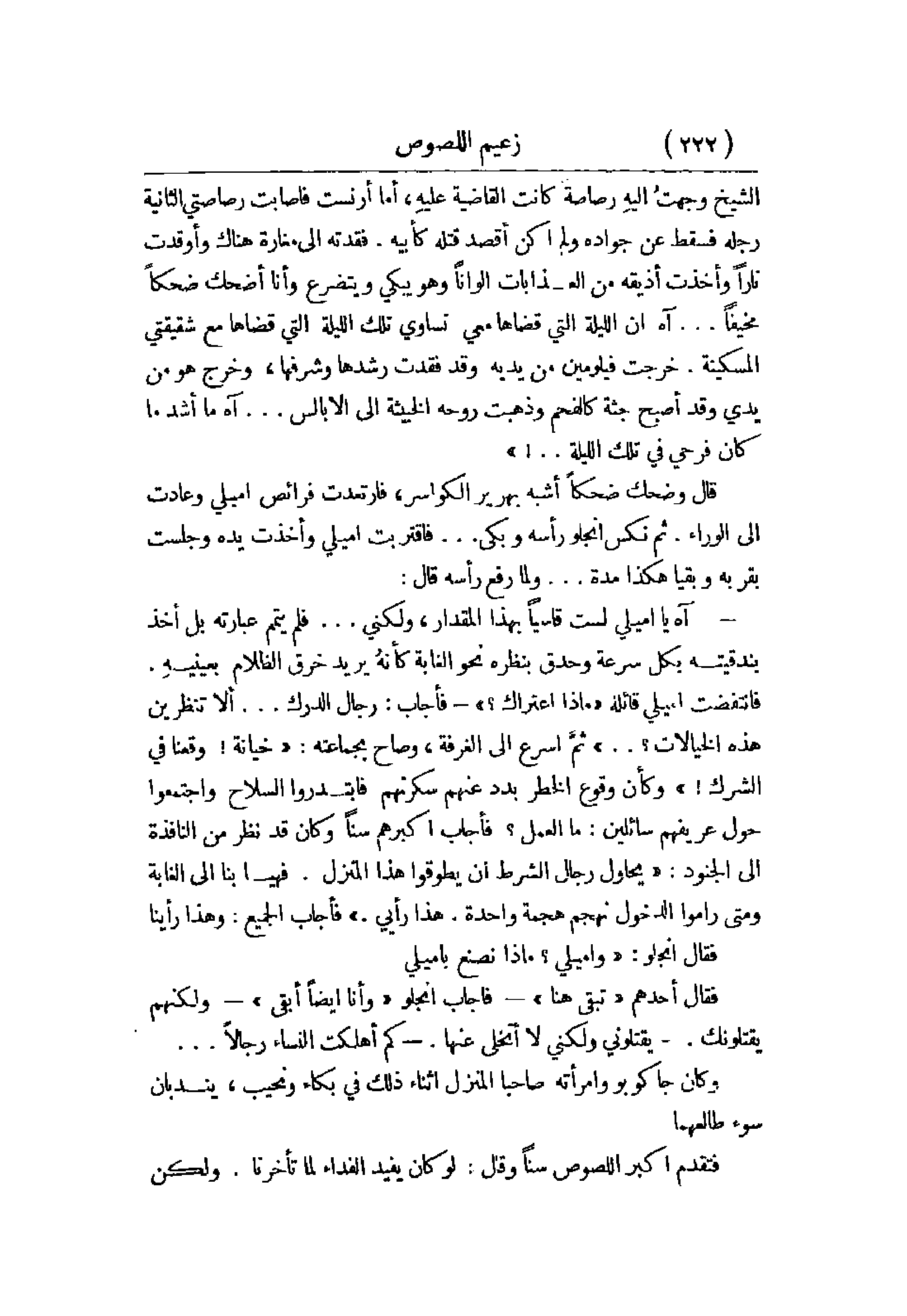 الغرفة، وصاح بجماعته: خيانة! وقعنا في الشرك! وكأن وقوع الخطر بدد عنهم سكرتهم فابتدروا السلاح واجتمعوا حول عريفهم سائلين: ما العمل؟ فأجاب أكبرهم سناً وكان قد نظر من النافذة إلى الجنود: يحاول رجال الشرطة أن يطوقوا هذا المنزل. فهيا بنا إلى الغابة ومتى راموا الدخول نهجم هجمة واحدة. هذا رأيي. فأجاب الجميع: وهذا رأينا.