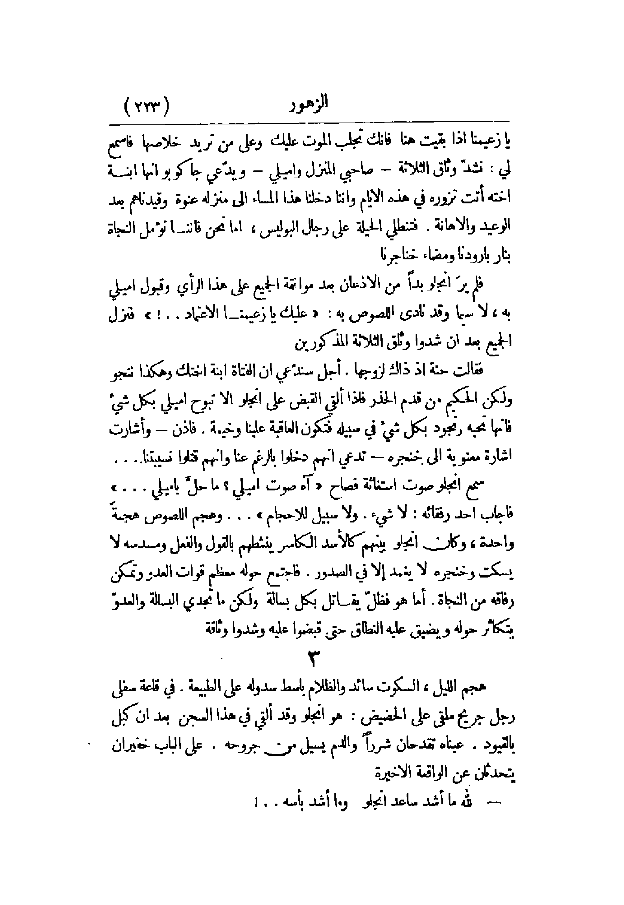 سمع أنجلو صوت استغاثة فصاح آه صوت إميلي؟ ما حل بإميلي. . . فأجاب أحد رفقائه: لا شيء. ولا سبيل للإحجام. . . وهجم اللصوص هجمة واحدة، وكان أنجلو بينهم كالأسد الكاسر ينشطهم بالقول والفعل ومسدسه لا يسكت وخنجره لا يغمد إلا فص الصدور. فاجتمع حوله معظم قوات العدو وتمكن رفاقه من النجاة. أما هو فظل يقاتل بكل بسالة ولكن ما تجدي البسالة والعدو يتكاثر حوله ويضيق عليه النطاق حتى قبضوا عليه وشدو وثاقه.