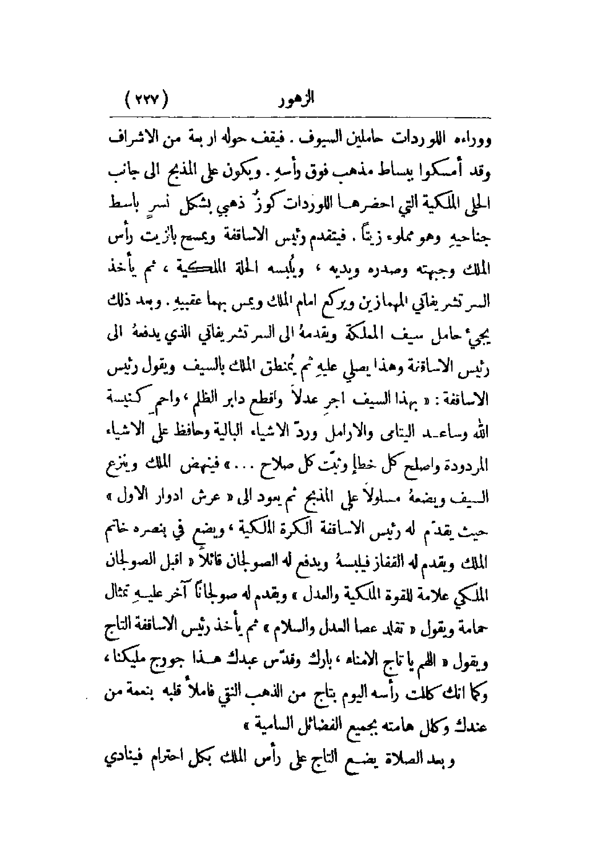 ووراءه اللوردات حاملين السيوف. فيقف حوله أربعة من الأشراف وقد امسكوا ببساط مذهب فوق رأسه. ويكون على المذبح إلى جانب الحلى الملكية التي أحضرها اللوردات كوز ذهبي بشكل نسر باسط جناحيه وهو مملوء زيتاً. فيتقدم رئيس الأساقفة ويمسح بالزيت رأس الملك وجبهته وصدره ويديه، ويلبسه الحلة الملكية، ثم يأخذ السر تشريفاتي المهمازين ويركع أمام الملك ويمس بهما عقبيه. وبعد ذلك يجيء حامل سيف المملكة ويقدمه إلى السر تشريفاتي الذي يدفعه إلى رئيس الأساقفة وهذا يصلي عليه ثم يمنطق الملك بالسيف ويقول رئيس الأساقفة: بهذا السيف أجر عداً واقطع دابر الظلم، واحم كنيسة الله وساعد اليتامى والأرامل ورد الأشياء البالية وحافظ على الأشياء المردودة وأصلح كل خطأ وثبت كل صلاح. . . . فينهض الملك وينزع السيف ويضعه مسلولاً على المذبح ثم يعود إلى عرش إدوارد الأول حيث يقدم له رئيس الأساقفة الكرة الملكية، ويضع في بنصره خاتم الملك ويقدم له القفاز فيلبسه ويدفع له الصولجان قائلاً: اقبل الصولجان الملكي علامةً للقوة الملكية والعدل ويقدم له صولجاناً آخر عليه تمثال حمامة ويقول: تقلد عصا العدل والسلام ثم يأخذ رئيس الأساقفة التاج ويقول: اللهم يا تاج الأمناء، بارك وقدس عبدك هذا جورج مليكنا، وكما أنك كللت رأسه اليوم بتاج من الذهب النقي فاملأ قلبه بنعمة من عندك وكلل هامته بجميع الفضائل