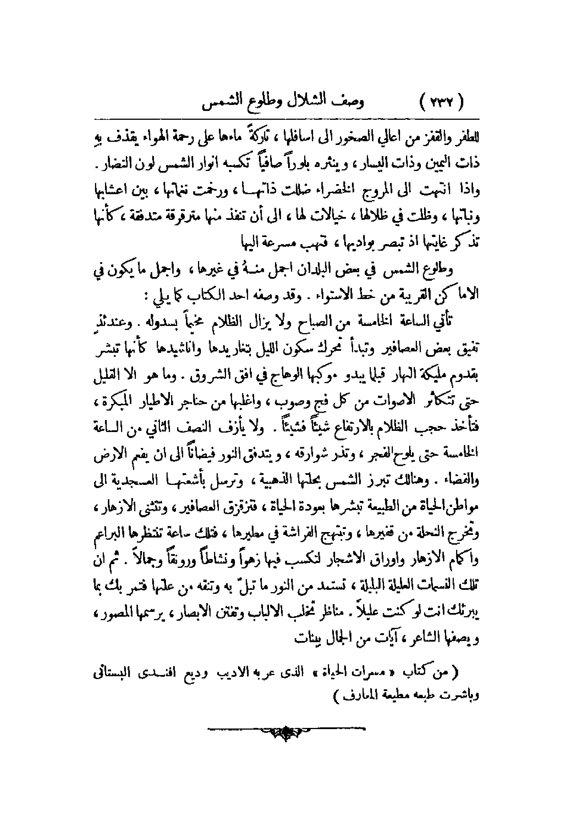 تأتي الساعة الخامسة من الصباح ولا يزال الظلام مخيماً بسدوله. وعندئذ تفيق بعض العصافير وتبدأ تحرك سكون الليل بتغاريدها وأناشيدها كأنها تبشر بقدوم مليكة النهار قبلما يبدو موكبها الوهاج في أفق الشروق. وما هو إلا القليل حتى تتكاثر الأصوات من كل فج وصوب، وأغلبها من حناجر الأطيار المبكرة، فتأخذ حجب الظلام بالارتفاع شيئاً فشيئاً. ولا يأزف النصف الثاني من الساعة الخامسة حتى يلوح الفجر، وتذر شوارقه، ويتدفق النور فيضاً إلى أن يفعم الأرض والفضاء. وهنالك تبرز الشمس بحلتها الذهبية، وترسل بأشعتها العسجدية إلى مواطن الحياة من الطبيعة تبشرها بعودة الحياة، فتزقزق العصافير، وتتثنى الأزهار، وتخرج النحلة من قفيرها، وتبتهج الفراشة في مطيرها، فتلك ساعة تنتظرها