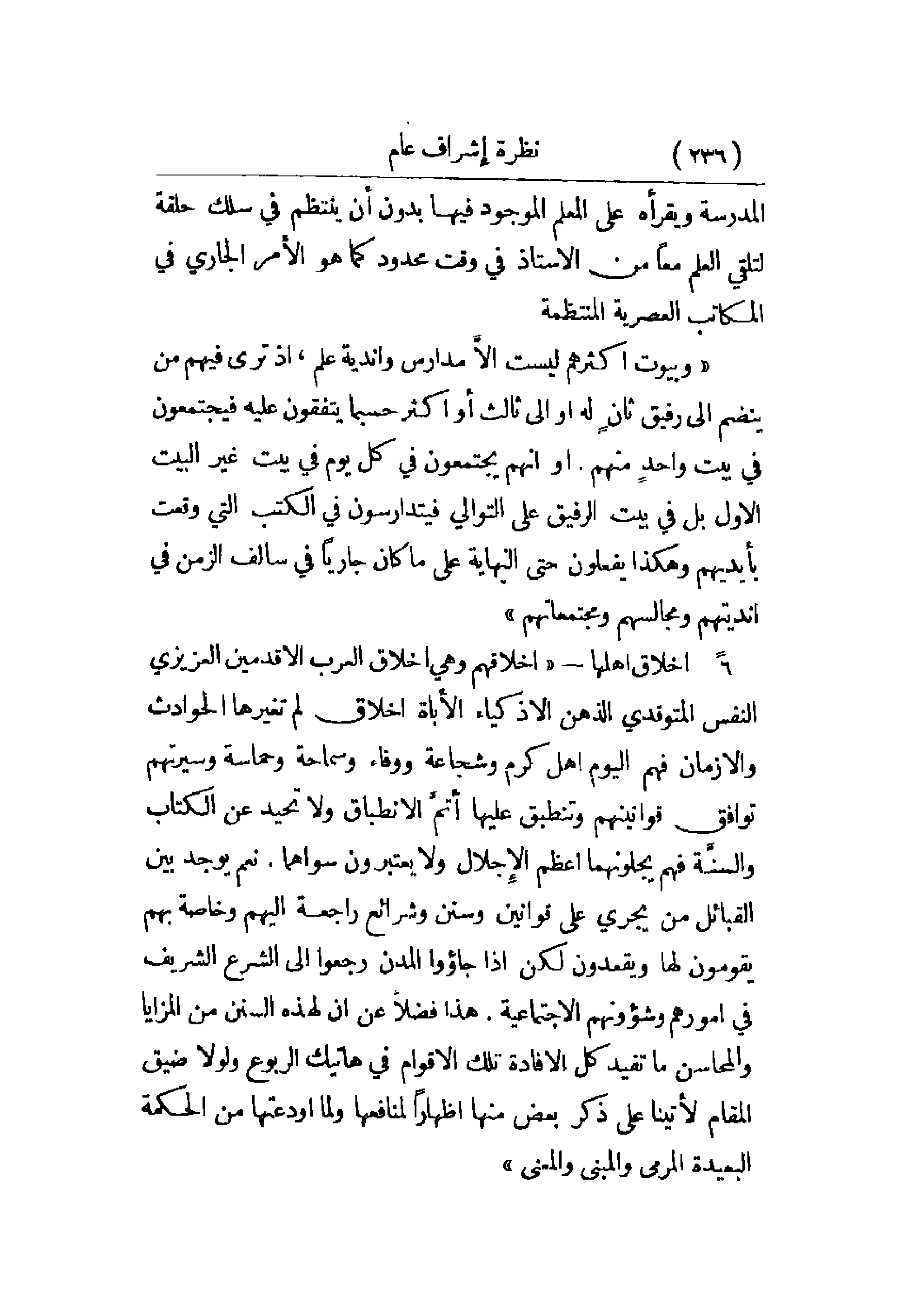 وبيوت أكثرهم ليست إلا مدارس وأندية علم، إذ ترى فيهم من ينضم إلى رفيق ثانٍ له او إلى ثالث أو أكثر حسبما يتفقون عليه فيجتمعون في بيت واحد منهم. أو أنهم يجتمعون في كل يوم في بيت غير البيت الأول بل في بيت الرفيق على التوالي فيتدارسون في الكتب التي وقعت بأيديهم وهكذا يفعلون حتى النهاية على ما كان جارياً في سالف الزمن في أنديتهم ومجالسهم ومجتمعاتهم.