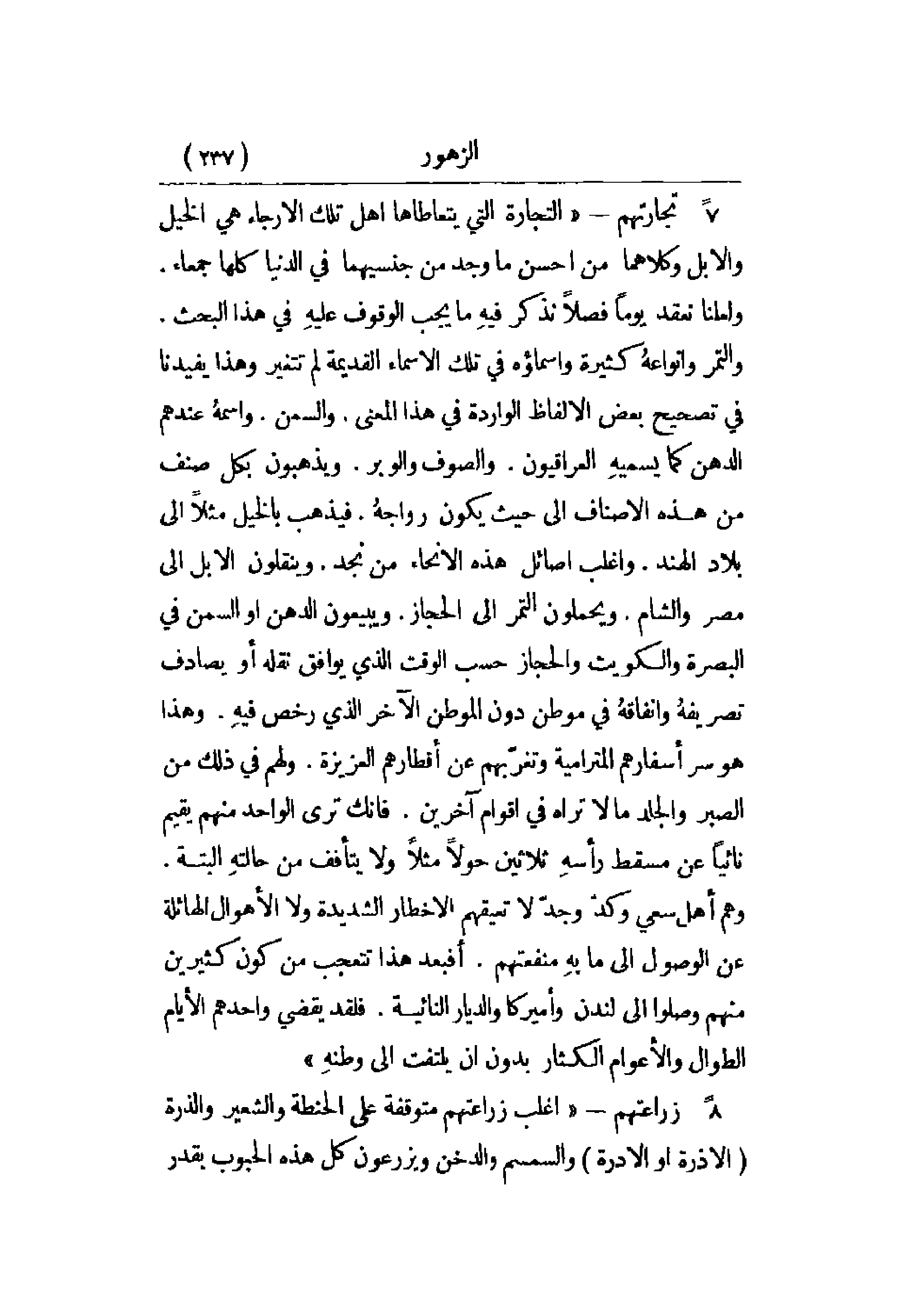 7 - تجارتهم - التجارة التي يتعاطاها أهل تلك الأرجاء هي الخيل والإبل وكلاهما من أحسن ما وجد من جنسيهما في الدنيا كلها جمعاء. ولعلنا نعقد يوماً فصلاً نذكر فيه ما يجب الوقوف عليه ف هذا البحث. والتمر وأنواعه كثيرة وأسماؤه في تلك الأسماء القديمة لم تتغير وهذا يفيدنا في تصحيح بعض الألفاظ الواردة في هذا المعنى. والسمن واسمه عندهم الدهن كما يسميه العراقيون. والصوف والوبر، ويذهبون بكل صنف من هذه الأصناف إلى حيث يكون رواجه. فيذهب بالخيل مثلاً إلى بلاد الهند. وأغلب أصائل هذه الأنجاء من نجد. وينقلون الإبل إلى مصر والشام. ويحملون التمر إلى الحجاز. ويبيعون الدهن أو السمن في البصرة والكويت والحجاز حسب الوقت الذي يوافق نقله أو يصادف تصريفه وإنفاقه في موطن دون الموطن الآخر الذي رخص فيه. وهذا هو سر أسفارهم المترامية وتغربهم عن أقطارهم العزيزة. ولهم في ذلك من الصبر والجلد ما لا تراه في أقوام آخرين.