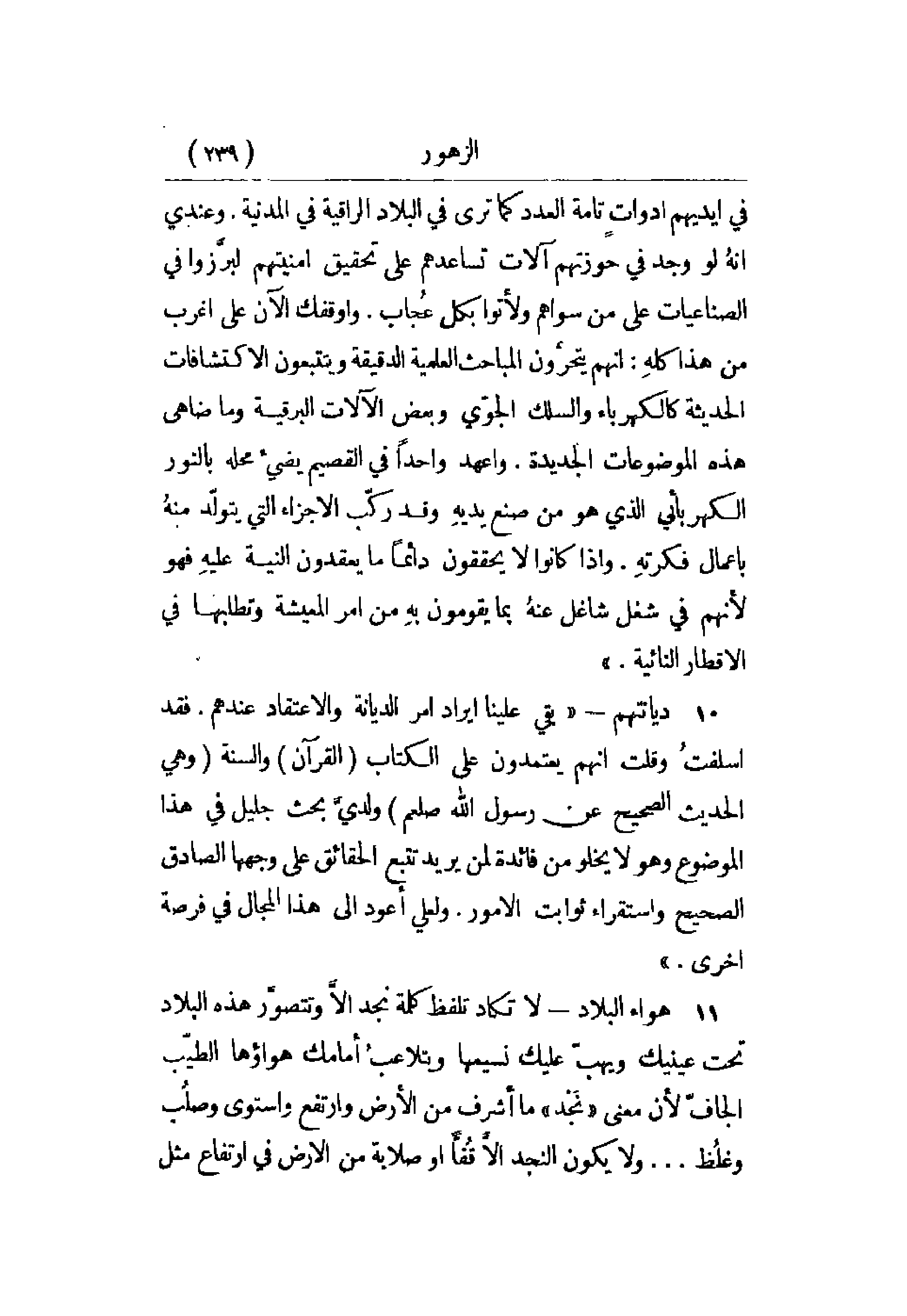 من هذا كله: إنهم يتحررون المباحث العلمية الدقيقة ويتتبعون الاكتشافات الحديثة كالكهرباء والسلك الجوي وبعض الآلات البرقية وما ضاهى هذه الموضوعات الجديدة. وأعهد واحداً في القصيم يضيء محله بالنور الكهربائي الذي هو من صنع يديه وقد ركب الأجزاء التي يتولد منه بإعمال فكرته. وإذا كانوا لا يحققون دائماً ما يعقدون النية عليه فهو لأنهم في شغل شاغل عنه بما يقومون به من أمر المعيشة وتطلبها في الأقطار النائية.
