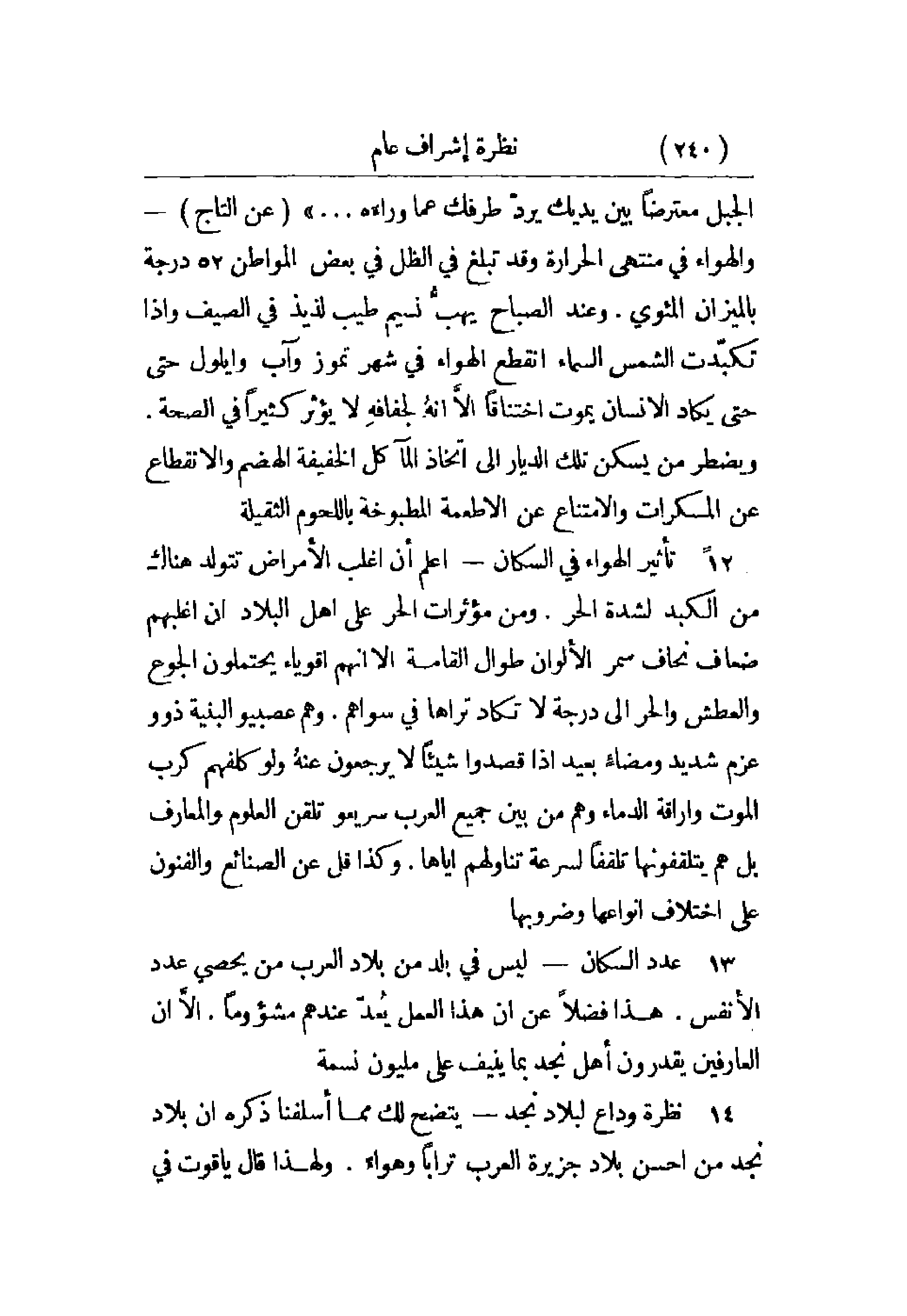 12 - تأثير الهواء في السكان - أعلم أن اغلب الأمراض تتولد هناك من الكبد لشدة الحر. ومن مؤثرات الحر على أهل البلاد أن أغلبهم ضعاف نحاف سمر الألوان طوال القامة إلا أنهم أقوياء يحتملون الجوع والعطش والحر إلى درجة لا تكاد تراها في سواهم. وهم عصبيو البنية ذوو عزم شديد ومضاء بعيد إذا قصدوا شيئاً لا يرجعون عنه ولو كلفهم كرب الموت وإراقة الدماء وهم من بين جميع العرب سريعو تلقن العلوم والمعارف بل هم يتلقفونها تلقفاً لسرعة تناولهم إياها. وكذا قل عن الصنائع والفنون على اختلاف أنواعها وضروبها.