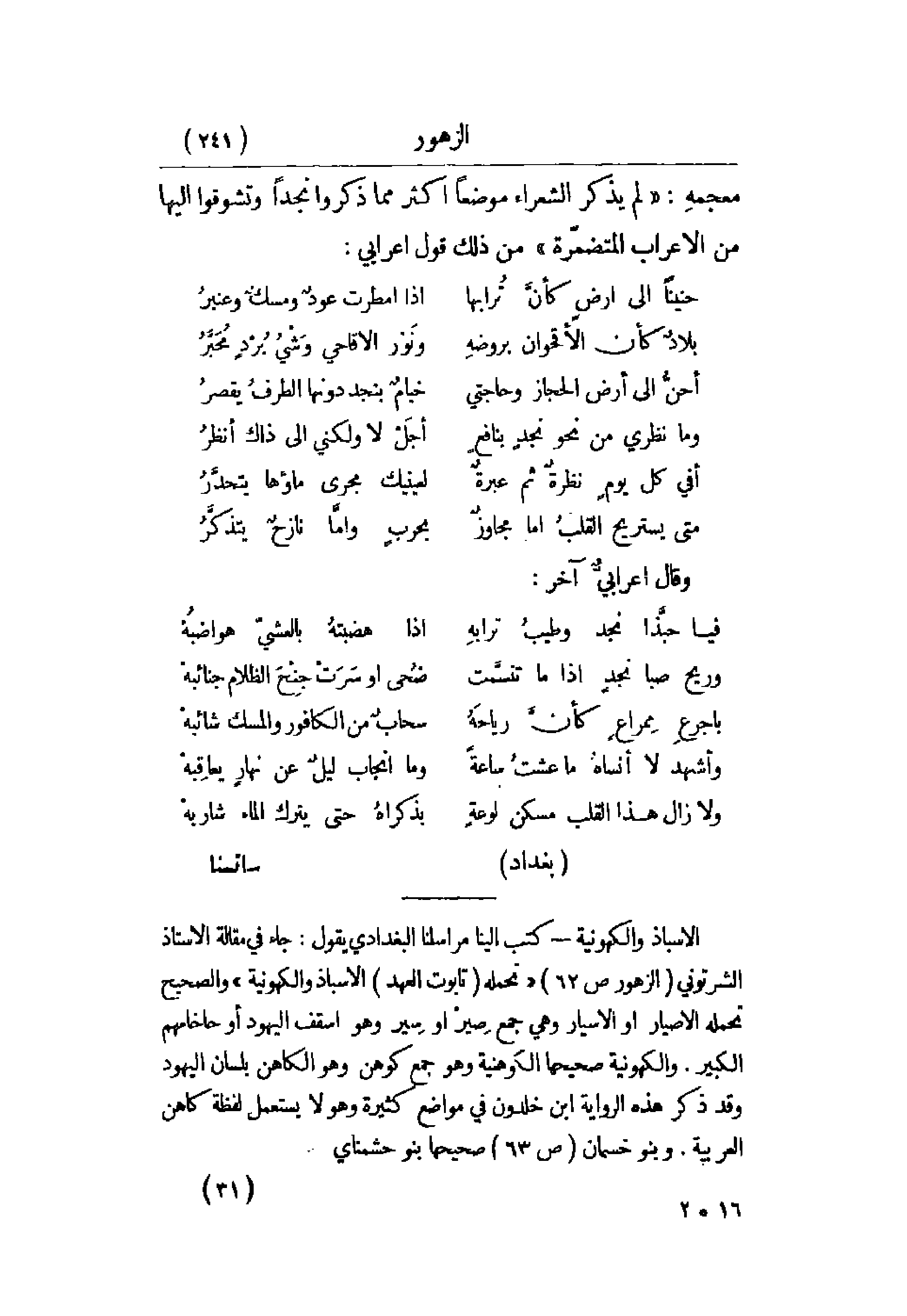 معجمه: لم يذكر الشعراء موضعاً أكثر مما ذكروا نجداً وتشوقوا إليها من الأعراب المتضمرة. من ذلك قول أعرابي: