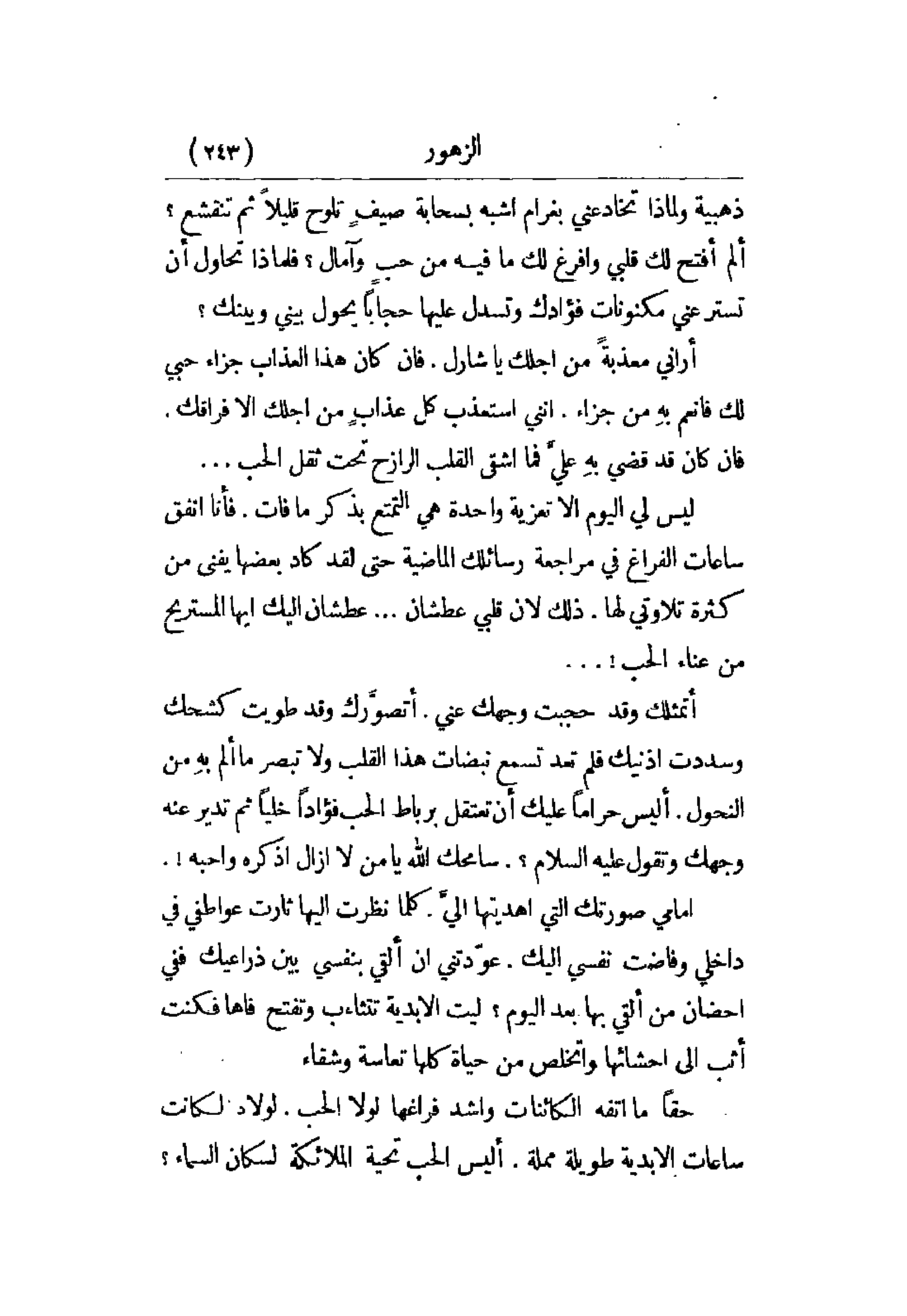 أتمثلك وق حجبت وجهك عني. أتصورك وقد طويت كشحك وسددت أذنيك فلم تعد تسمع نبضات هذا القلب ولا تبصر ما ألم به من النحول. أليس حراماً عليك أن تعتقل برباط الحب فؤاداً خلياً ثم تدير عنه وجهك وتقول عليه السلام؟ سامحك الله يا من لا أزال أذكره وأحبه!.