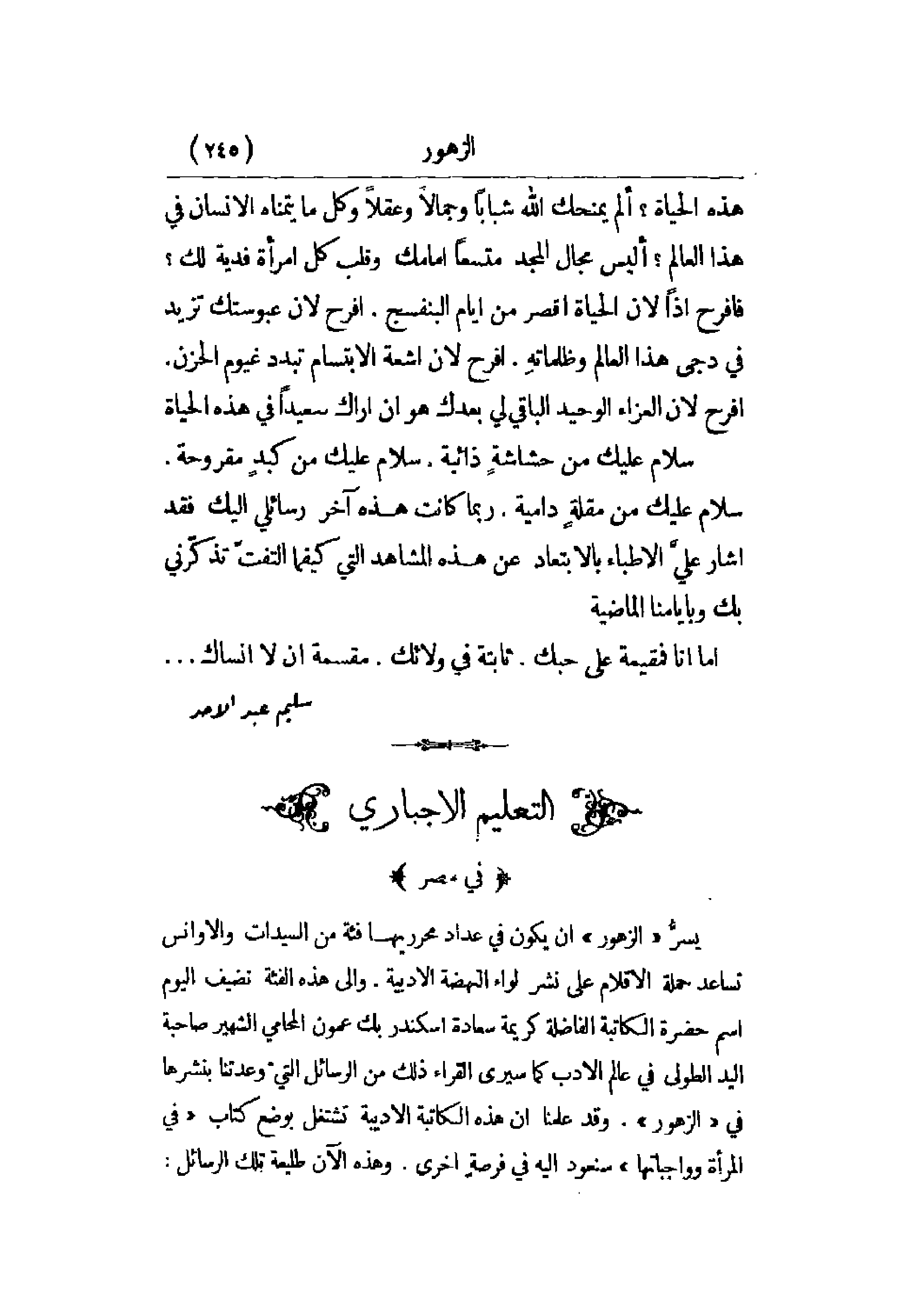 يسر الزهور أن يكون في عداد محرريها فئة من السيدات والأوانس تساعد في حملة الأقلام على نشر لواء النهضة الأدبية. وإلى هذه الفئة نضيف اليوم اسم حضرة الكاتبة الفاضلة كريمة سعادة اسكندر بك عمون المحامي الشهير صاحبة اليد الطولى في عالم الأدب كما سيرى القراء ذلك من الرسائل التي وعدتنا بنشرها في الزهور. وقد علمنا أن هذه الكاتبة الأديبة تشتغل بوضع في المرأة وواجباتها سنعود إليه في فرصة أخرى. وهذه الآن طليعة تلك الرسائل: