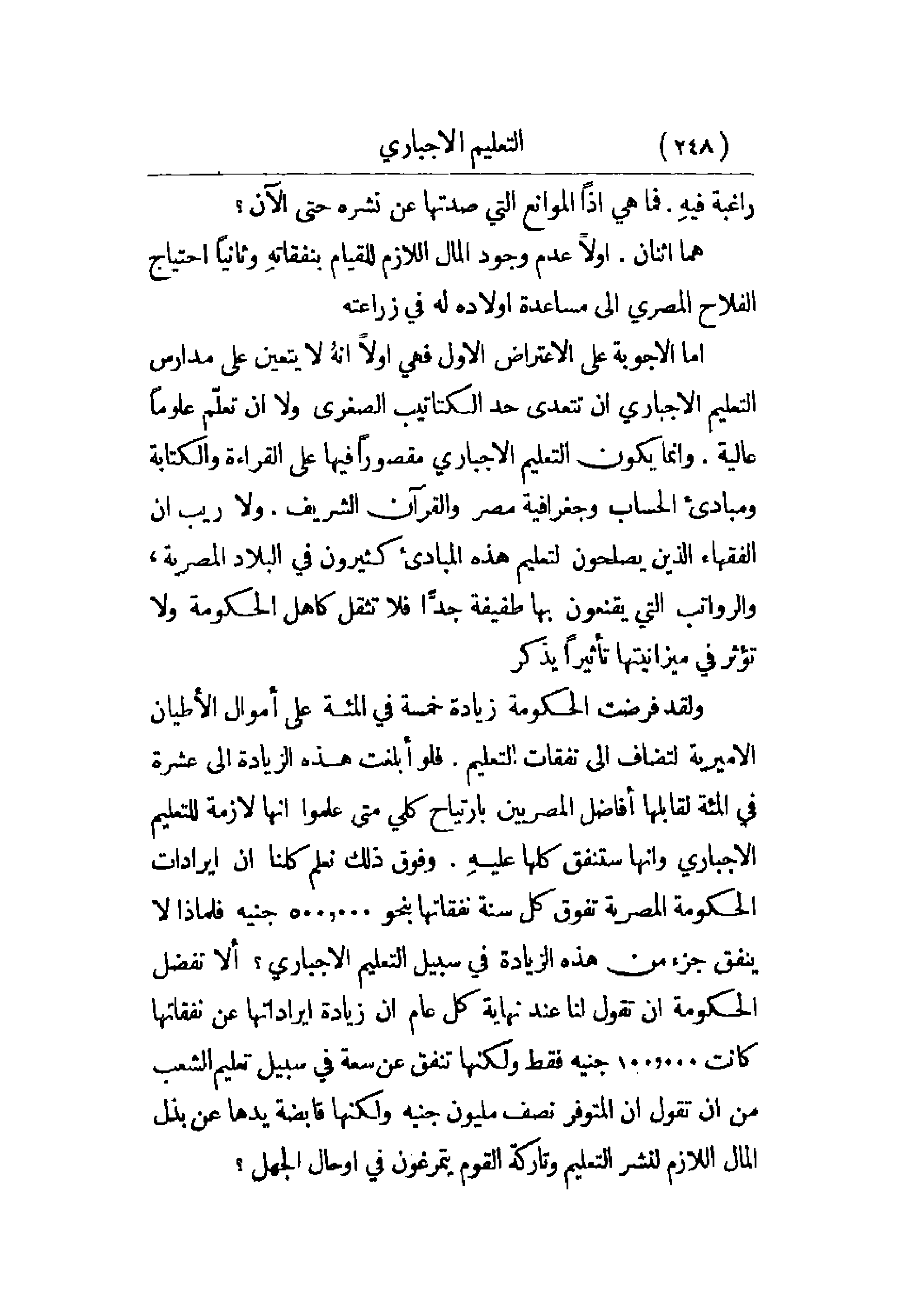 إيرادات الحكومة المصرية تفوق كل سنة نفقاتها بنحو 500. 000 جنيه فلماذا لا ينفق جزء من هذه الزيادة في سبيل التعليم الإجباري؟ ألا تفضل الحكومة أن تقول لنا عند نهاية كل عام أن زيادة إيراداتها عن نفقاتها كانت 100. 000 جنيه فقط ولكنها تنفق عن سعة في سبيل تعليم الشعب من أن تقول أن المتوفر نصف مليون جنيه ولكنها قابضة يدها عن بذل المال اللازم لنشر التعليم وتاركةً القوم يتمرغون في أوحال الجهل؟