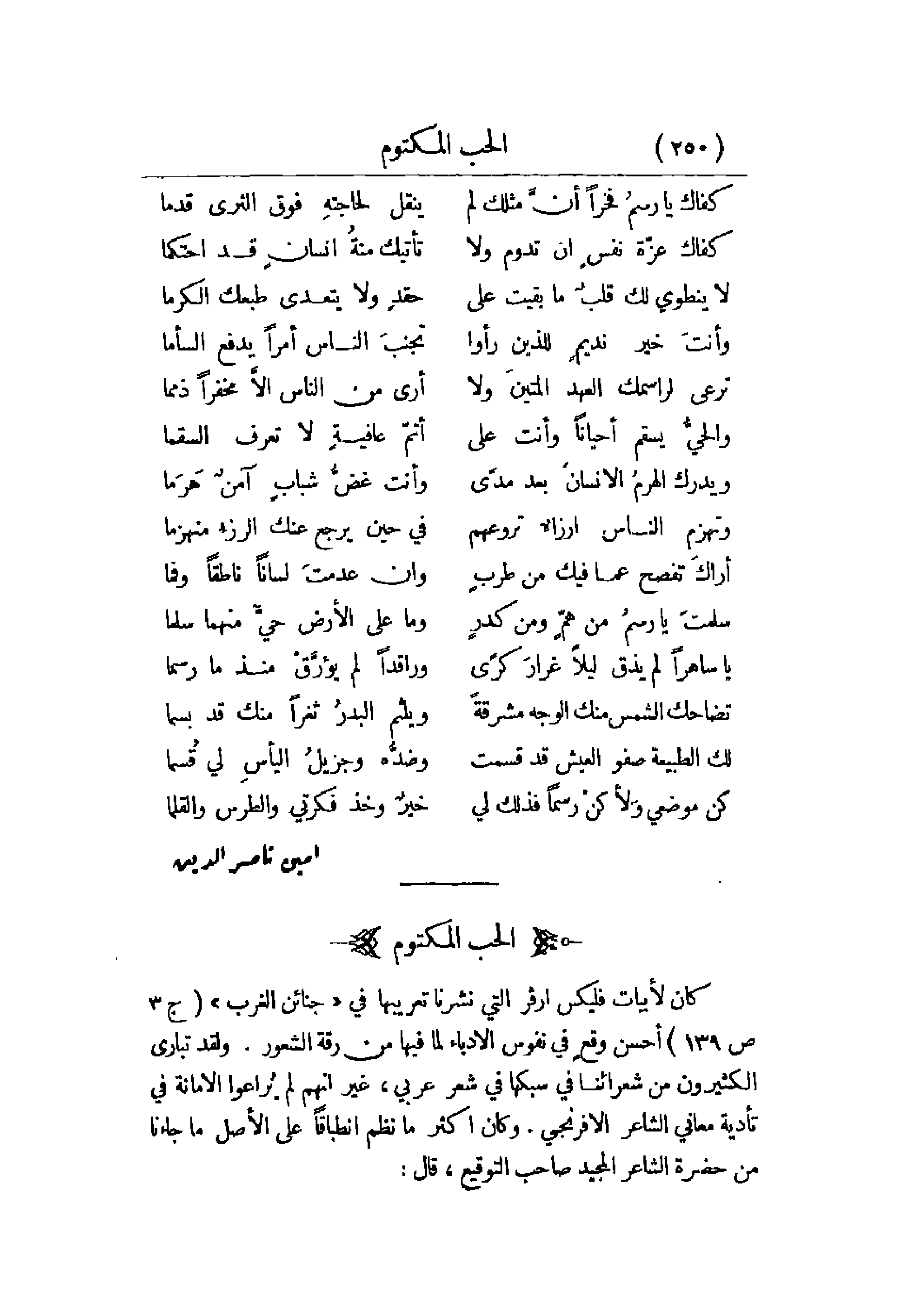 كان لأبيان فليكس أرفر الني نشرنا تعريبها في جنائن الغرب (ج 3 ص 139) أحسن وقع في نفوس الأدباء لما فيها من رقة الشعور. ولقد تبارى الكثيرون من شعرائنا في سبكها في شعر عربي، غير أنهم لم يراعوا الأمانة في تأدية معاني الشاعر الإفرنجي. وكان أكثر ما نظم انطباقاً على الأصل ما جاءنا من حضرة الشاعر المجيد صاحب التوقيع، قال:
