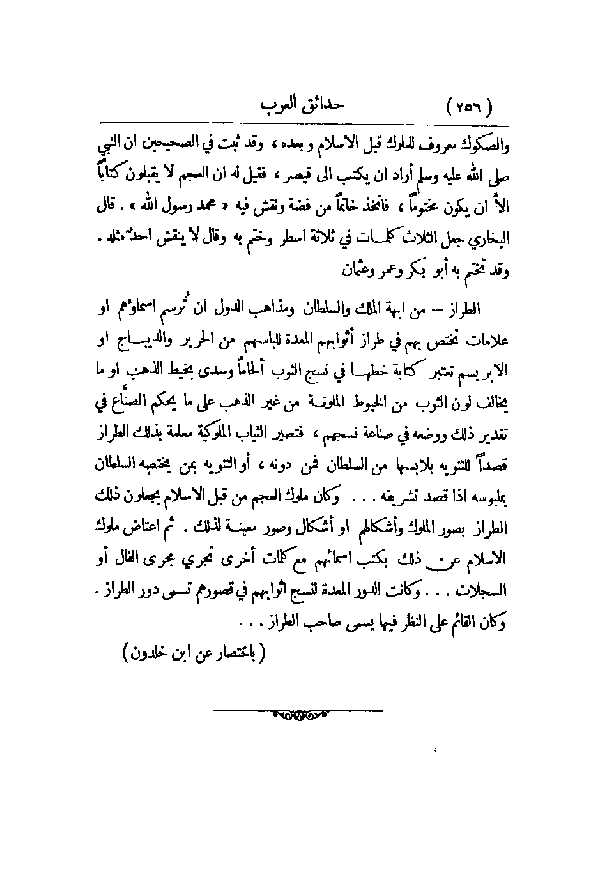 بمن يختصه السلطان بملبوسه إذا قصد تشريفه. . . وكان ملوك العجم من قبل الإسلام يجعلون ذلك الطراز بصور الملوك وأشكالهم أو أشكال وصور معينة لذلك. ثم اعتاض ملوك الإسلام عن ذلك بكتب أسمائهم مع كلمات أخرى تجري مجرى الفال أو السجلات. . . . وكان الدور المعدة لنسج أثوابهم في قصورهم تسمى دور الطراز. وكان القائم على النظر فيها يسمى صاحب الطراز. . .