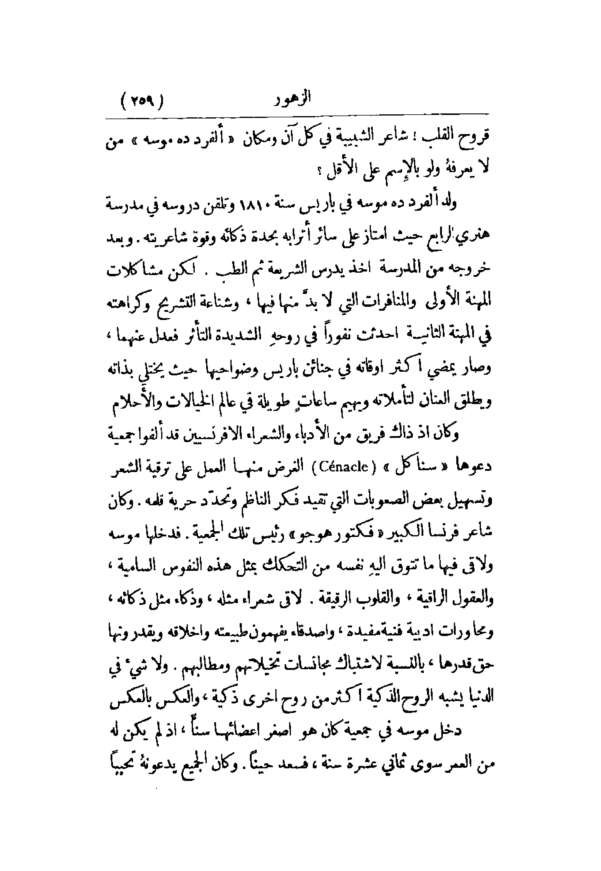 وكان إذ ذاك فريق من الأدباء والشعراء الإفرنسيين قد ألفوا جمعية دعوها سناكل الغرض منها العمل على ترقية الشعر وتسهيل بعض الصعوبات التي تقيد فكر الناظم وتحدد حرية قلمه. وكان شاعر فرنسا الكبير فكتور هوغو رئيس تلك الجمعية. فدخلها موسه ولاقى فيها ما تتوق إليه نفسه من التحكك بمثل هذه النفوس السامية، والعقول الراقية، والقلوب الرقيقة. لاقى شعراء مثله، وذكاء مثل ذكائه. ومحاورات أدبية فنية مفيدة، وأصدقاء يفهمون طبيعته وأخلاقه ويقدرونها حق قدرها، بالنسبة لاشتباك مجانسات تخيلاتهم ومطالبهم. ولا شيء في الدنيا يشبه الروح الذكية أكثر من روح أخرى ذكية، والعكس بالعكس.