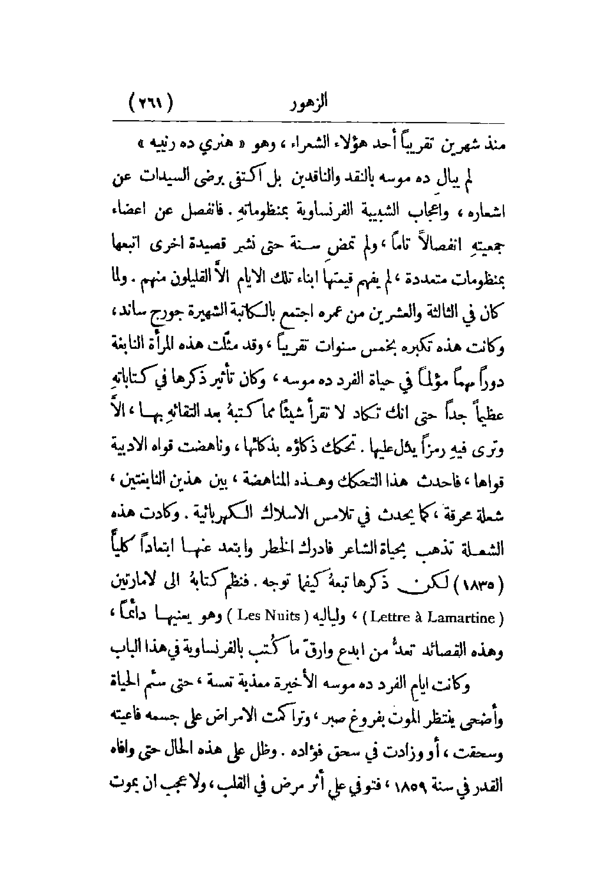 في تلامس الأسلاك الكهربائية. وكادت هذه الشعلة تذهب بحياة الشاعر فأدرك الخطر وابتعد عنها ابتعاداً كلياً (1835) لكن ذكرها تبعه كيفما توجه. فنظم كتابه إلى لامارتين ولياليه وهو يعينها دائماً، وهذه القصائد تعد من أبجع وأرق ما كتب بالفرنساوية في هذا الباب.