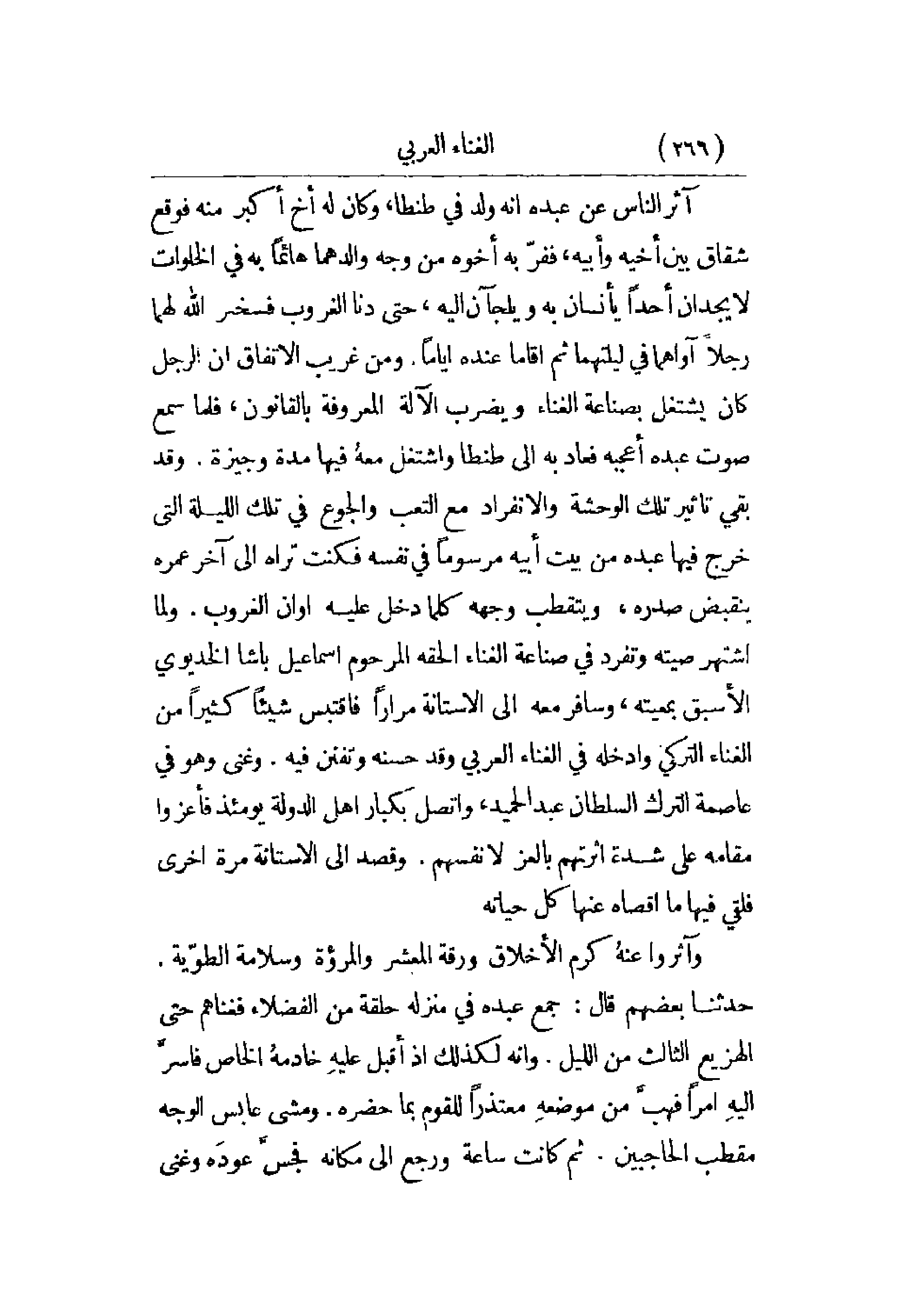 أوان الغروب. ولما اشتهر صيته وتفرد في صناعه الغناء ألحقه المرحوم إسماعيل باشا الخديوي الأسبق بمعيته، وسافر معه إلى الأستانة مراراً فاقتبس شيئاً كثيراً من الغناء التركي وأدلخه في الغناء العربي وقد حسنه وتفنن فيه. وغنى وهو في عاصمة الترك السلطان عبد الحميد، واتصل بكبار أهل الدولة يومئذ فأوعزوا مقامه على شده أثرتهم بالعز لأنفسهم. وقصد إلى الأستانة مرة أخرى فلقي فيها ما أقصاه عنها كل حياته.