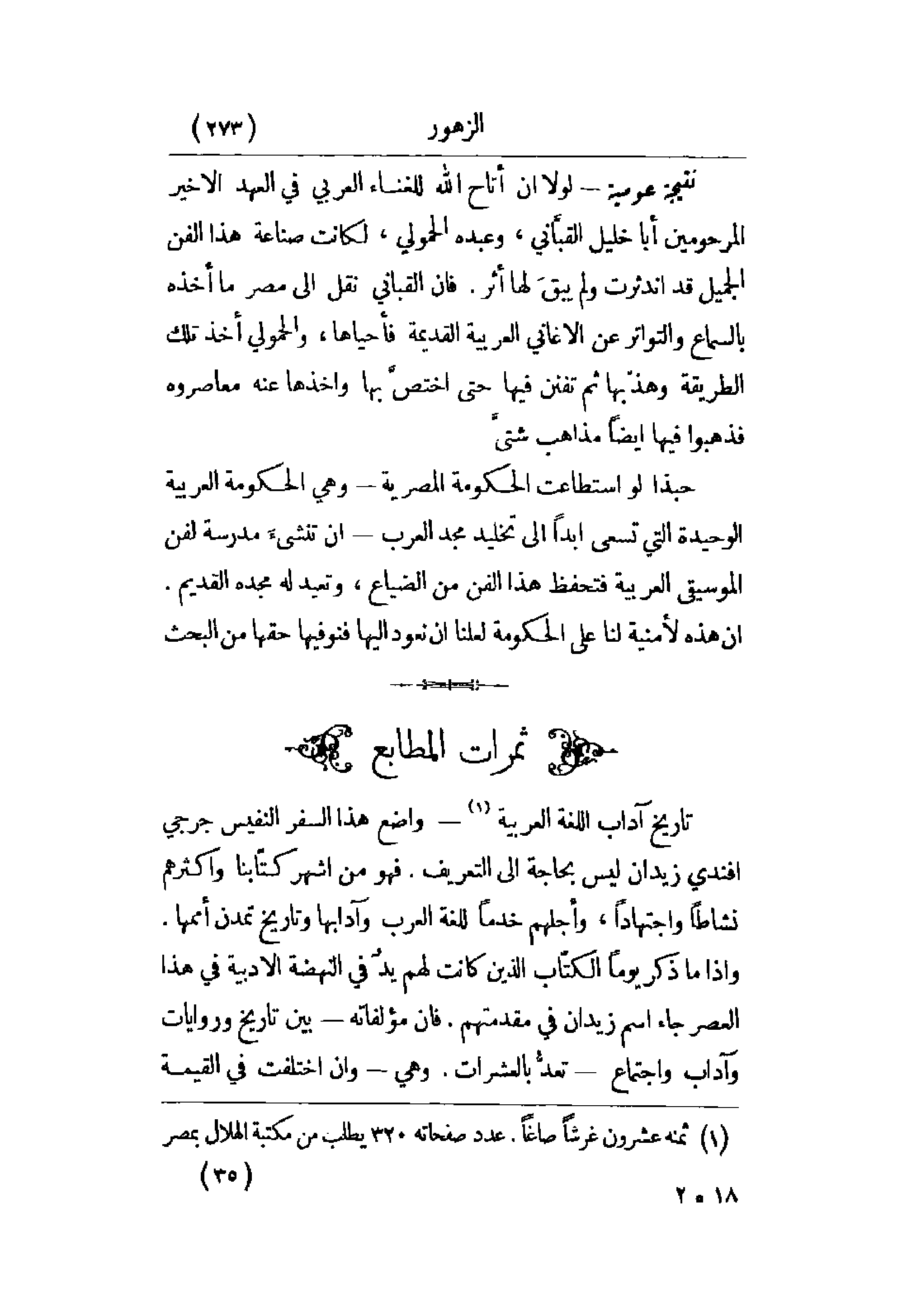 تاريخ آداب اللغة العربية - واضع هذا السفر النفيس جرجي أفندي زيدان ليس بحاجة إلى التعريف. فهو من أشهر كتابنا وأكثرهم نشاطاً واجتهادا، ً وأجلهم خدماً للغة العرب وآدابها وتاريخ تمدن أممها. وإذا ما ذكر يوماً الكتاب الذين كانت لهم يد في النهضة الأدبية في هذا العصر جاء اسم زيدان في مقدمتهم. فإن مؤلفاته - بين تاريخ وروايات وآداب واجتماع - تعد بالعشرات. وهي - وإن اختلفت في القيمة