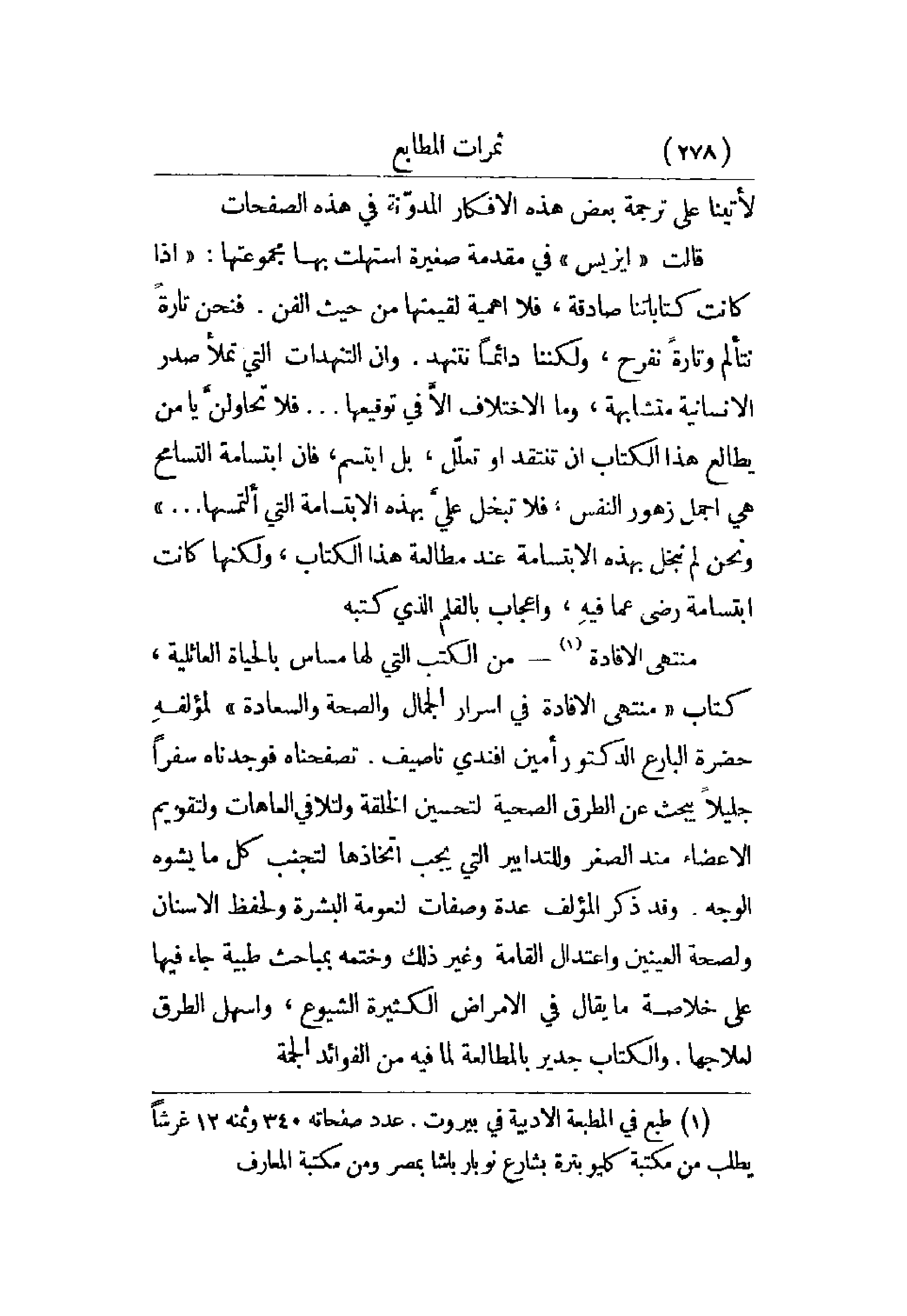 منتهى الإفادة - من الكتب التي لها مساس بالحياة العائلية، كتاب منتهى الإفادة في أسرار الجمال والصحة والسعادة لمؤلفه حضرة البارع الدكتور أمين أفندي ناصيف. تصفحناه فوجدناه سفراً جليلاً يبحث عن الطرق الصحية لتحسين الخلقة ولتلافي العاهات ولتقويم الأعضاء منذ الصغر وللتدابير التي يجب اتخاذها لتجنب كل ما يشوه الوجه. وقد ذكر المؤلف عدة وصفات لنعومة البشرة ولحفظ الأسنان ولصحة العينين واعتدال القامة وغير ذلك وختمه بمباحث طبية جاء فيها على خلاصة ما يقال في الأمراض الكثيرة الشيوع،