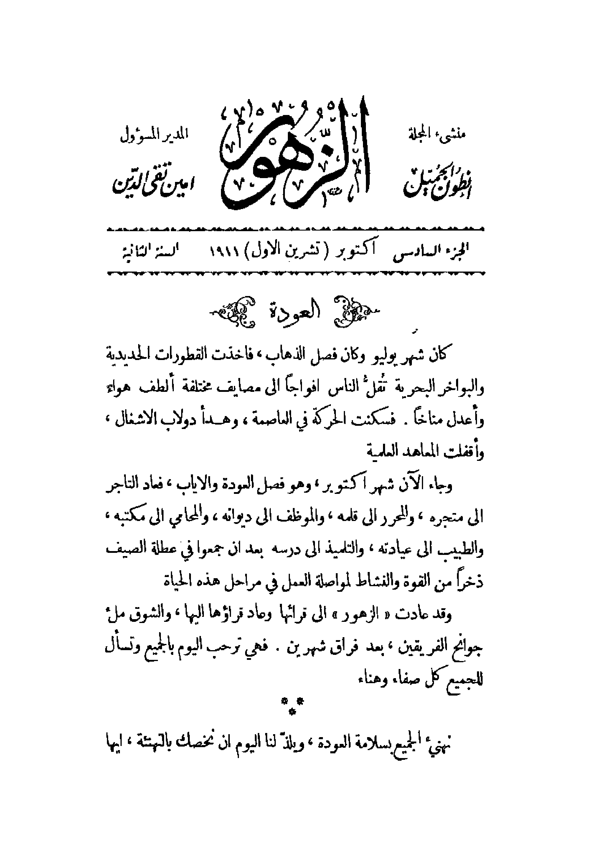 وقد عادت الزهور إلى قرائها وعاد قراؤها إليها، والشوق ملء جوانح الفريقين، بعد فراق شهرين. فهي ترحب اليوم بالجميع وتسأل للجميع كل صفاء وهناء.