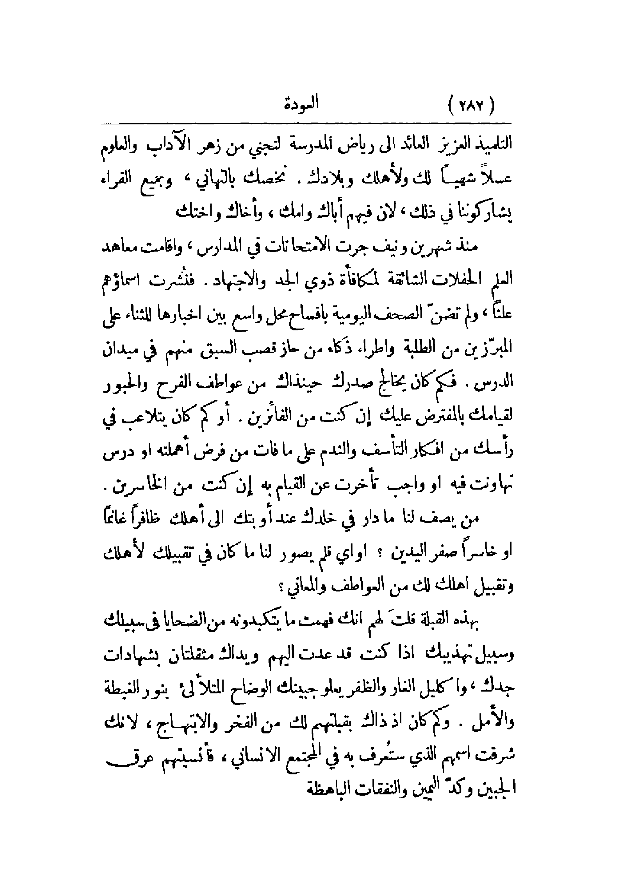 منذ شهرين ونيف جرت الامتحانات في المدارس، وأقامت معاهد العلم الحفلات الشائقة لمكافأة ذوي الجد والاجتهاد. فنشرت أسماؤهم علناً، ولم تضن الصحف اليومية بإفساح محل واسع بين أخبارها للثناء على المبرزين من الطلبة وإطراء ذكاء من حاز قصب السبق منهم في ميدان الدرس. فكم كان يخالج صدرك حينذاك من عواطف الفرح والحبور لقيامك بالمفترض عليك إن كنت من الفائزين. أو كم كان يتلاعب في رأسك من أفكار التأسف والندم على ما فات من فرض أهملته أو درس تهاونت فيه أو واجب تأخرت عن القيام بع إن كنت من الخاسرين.