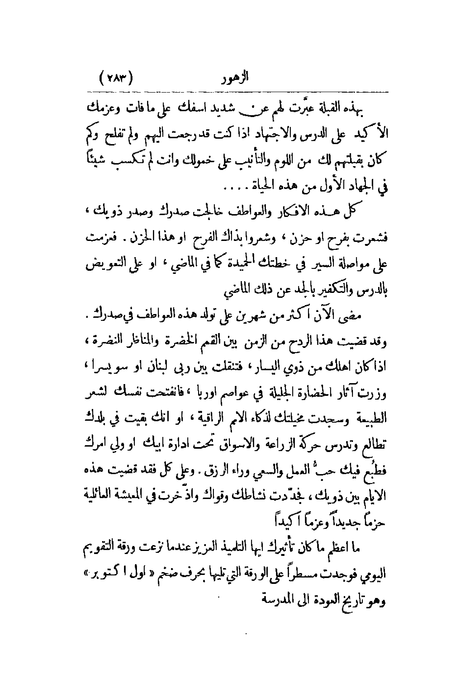 ما أعظم ما كان تأثيرك أيها التلميذ العزيز عندما نزعت ورقة التقويم اليومي فوجدت مسطراً على الورقة التي تليها بحرف ضخم أول أكتوبر وهو تاريخ العودة إلى المدرسة.