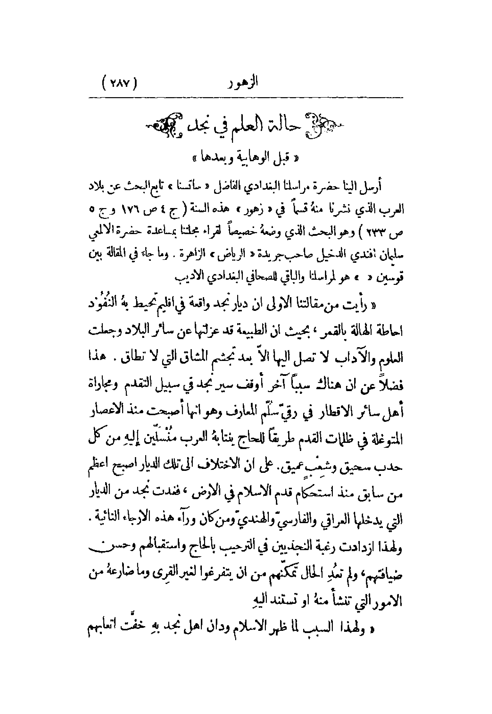 أرسل إلينا حضرة مراسلنا البغدادي الفاضل ساتسنا تابع البحث عن بلاد العرب الذي نشرنا منه قسماً في الزهور هذه السنة (ج 4 ص 176 وج 5 ص 233) وهو البحث الذي وضعه خصيصاً لقراء مجلتنا بمساعدة حضرة الألمعي سليمان أفندي الدخيل صاحب جريدة الرياض الزاهرة. وما جاء في المقالة بين قوسين هو لمراسلنا والباقي للصحافي البغدادي الأديب.