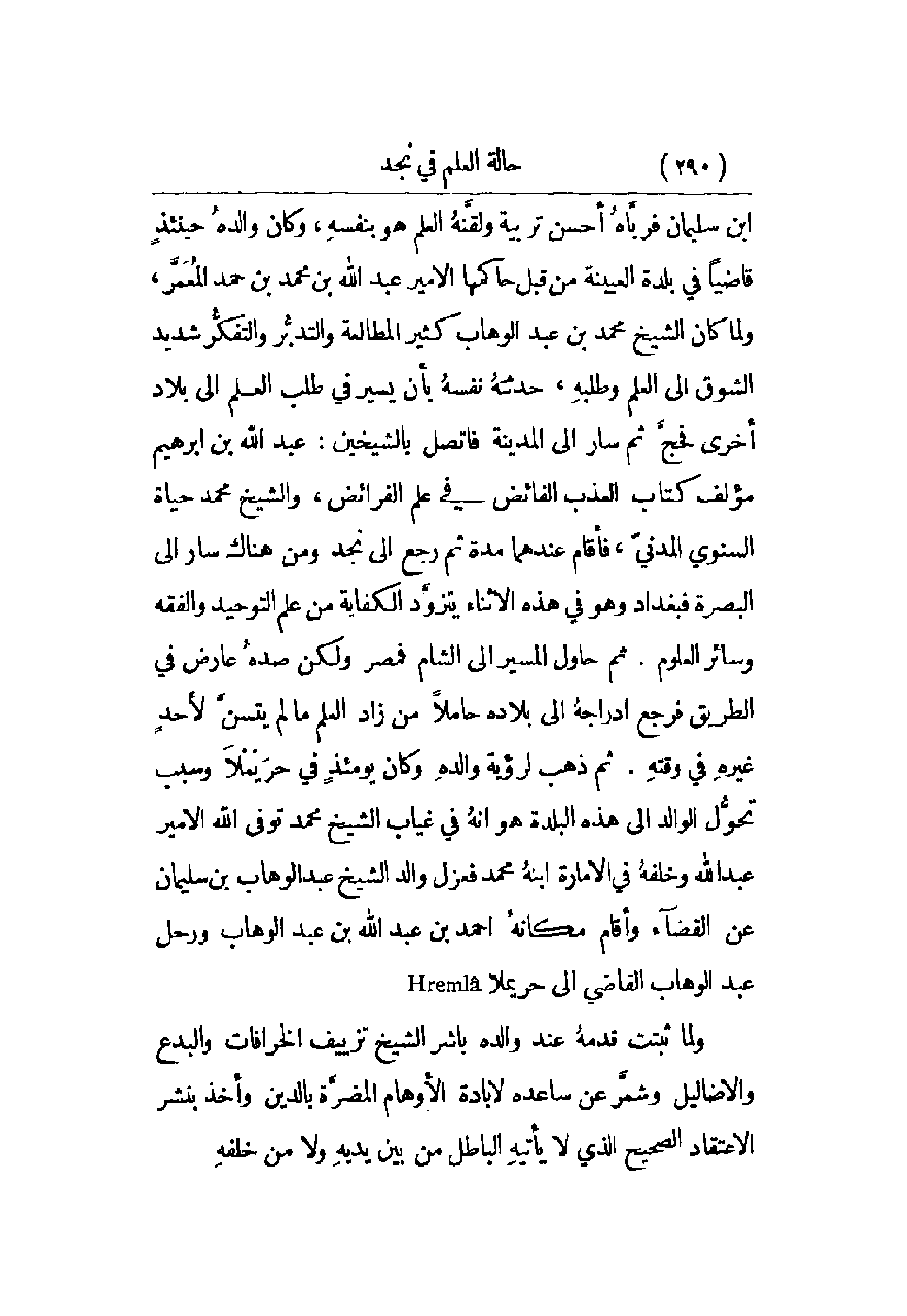 الأمير عبد الله بن محمد بن حمد المعمر، ولما كان الشيخ محمد بن عبد الوهاب كثي المطالعة والتدبر والتفكر شديد الشوق إلى العلم وطلبه، حدثته نفسه بأن يسير في طلب العلم إلى بلاد أخرى فحج ثم سار إلى المدينة فاتصل بالشيخين: عبد الله بن إبراهيم مؤلف كتاب العذب الفائض في علم الفرائض، والشيخ محمد حياة السنوي المدني، فأقام عندهما مدة ثم رجع إلى نجد ومن هناك سار إلى البصرة فبغداد وهو في هذه الأثناء يتزود الكفاية من علم التوحيد والفقه وسائر العلوم. ثم حاول المسير إلى الشام فمصر ولكن صده عارض في الطريق فرجع أدراجه إلى بلاده حاملاً من زاد العلم ما لم يتسن لأحد غيره في وقته. ثم ذهب لرؤية والده وكان يومئذ في حرَيْملا وسبب تحول الوالد إلى هذه البلدة هو أنه في غياب الشيخ محمد توفى الله الأمير عبد الله وخلفه في الإمارة ابنه محمد فعزل والد الشيخ عبد الوهاب بن سليمان عن القضاء وأقام مكانه أحمد بن عبد الله بن عبد الوهاب ورحل عبد الوهاب القاضي إلى حريملا