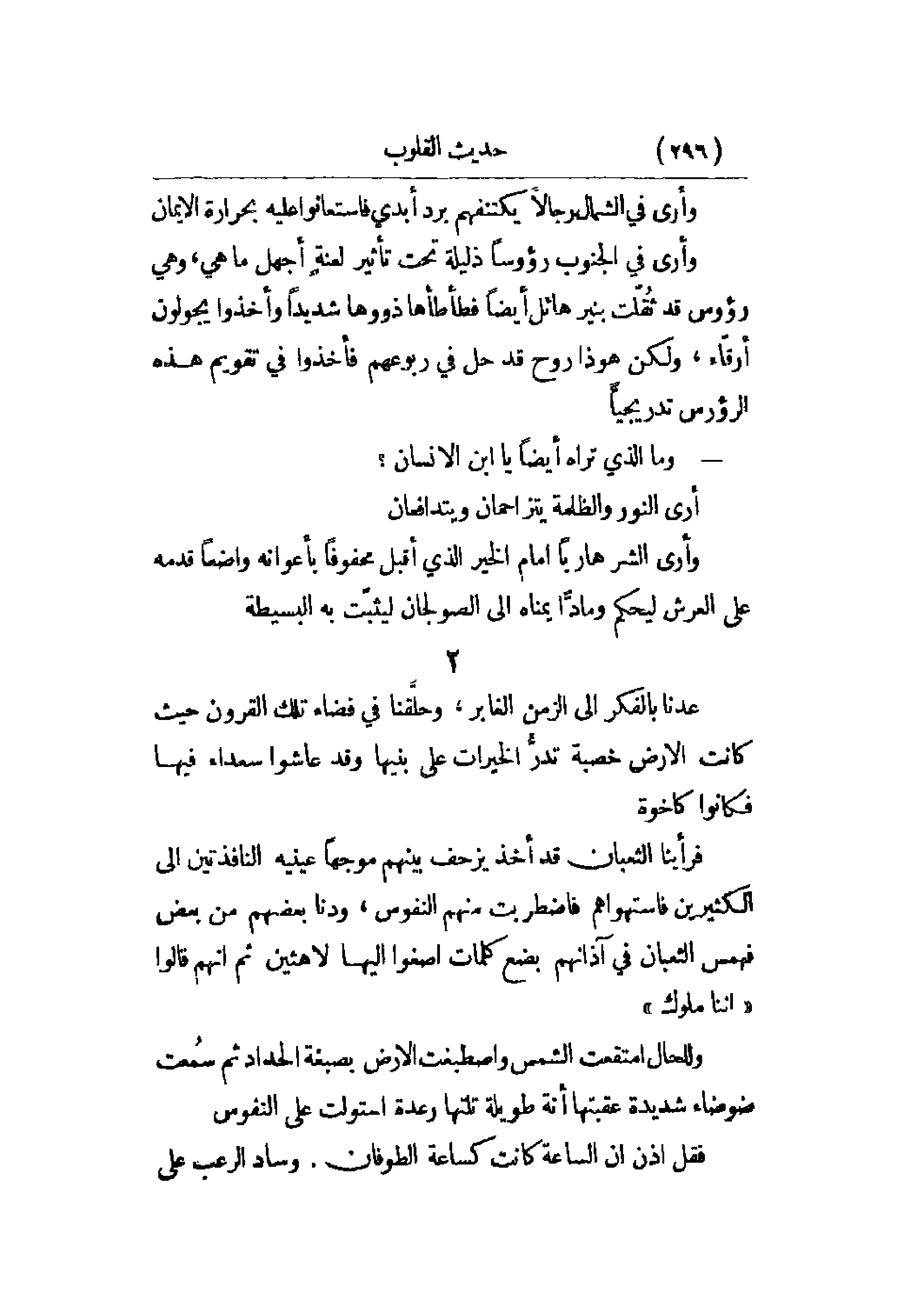 وأرى الشر هارباً أمام الخير الذي أقبل محفوفاً بأعوانه واضعاً قدمه على العرش ليحكم وماداً يمناه إلى الصولجان ليثبت به البسيطة.