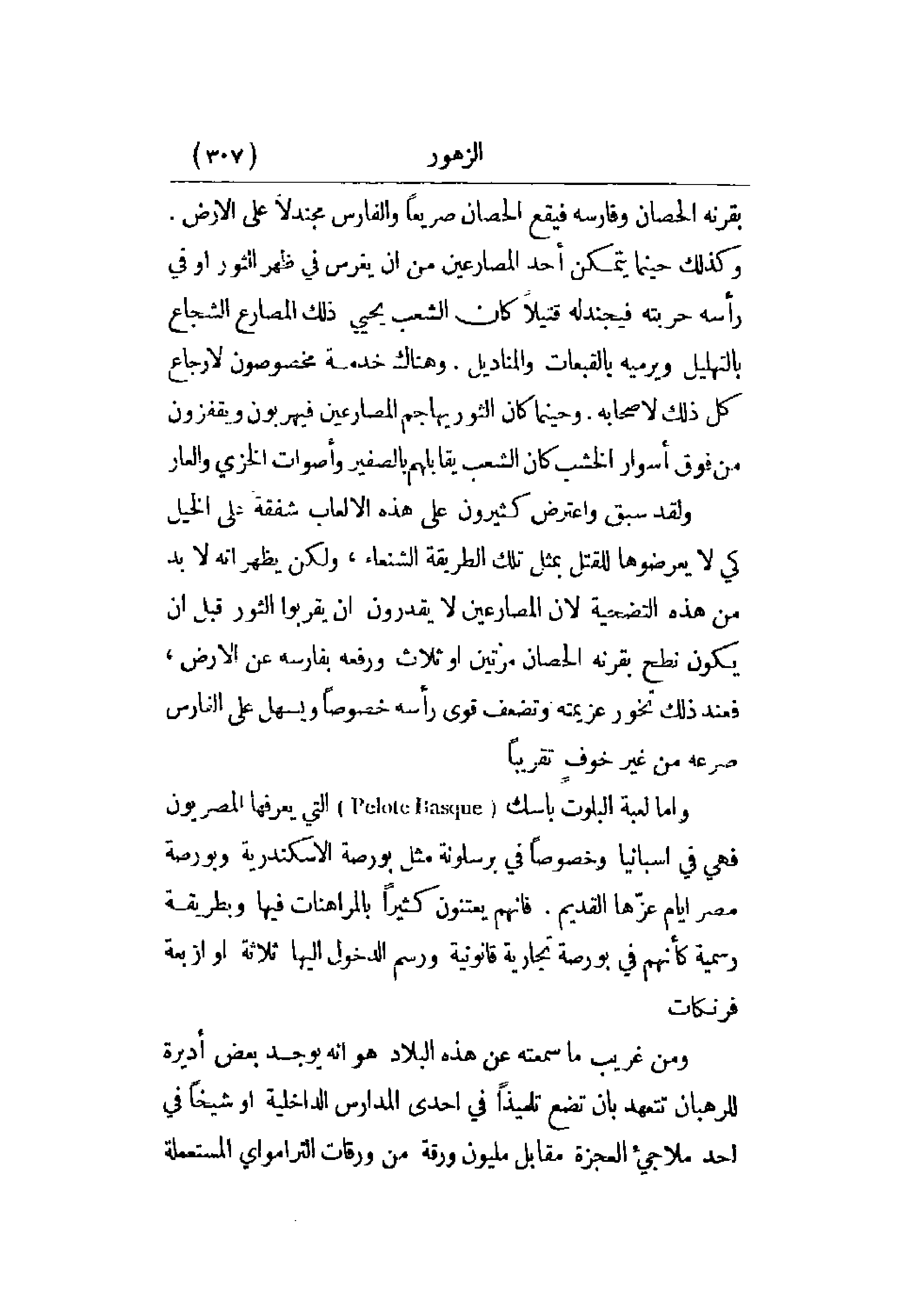 ولقد سبق واعترض كثيرون على هذه الألعاب شفقة على الخيل كي لا يعرضوها للقتل بمثل تلك الطريقة الشنعاء، ولكن يظهر أنه لا بد من هذه التضحية لأن المصارعين لا يقدرون أن يكون نطح بقرنه الحصان مرتين أو ثلاث ورفعه بفارسه عن الأرض، فعند ذلك تخور عزيمته وتضعف قوى رأسه خصوصاً ويسهل على الفارس صرعه من غير خوف تقريباً.