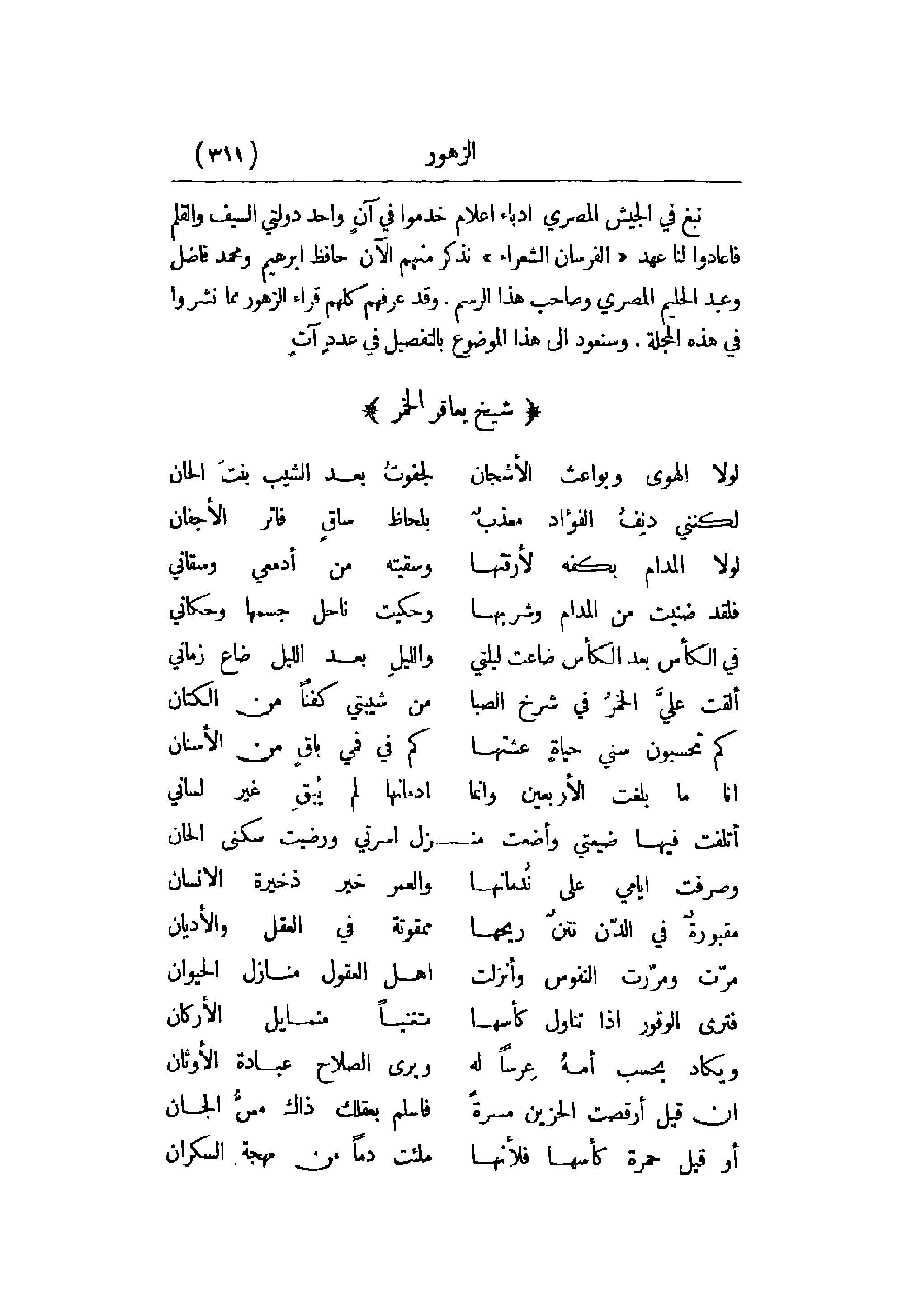 نبغ في الجيش المصري أدباء أعلام خدموا في آن واحد دولتي السيف والقلم فأعادوا لنا عهد الفرسان الشعراء نذكر منهم الآن حافظ إبراهيم ومحمد فاضل وعبد الحليم المصري وصاحب هذا الرسم. وقد عرفهم كلهم قراء الزهور مما نشروا في هذه المجلة. وسنعود إلى هذا الموضوع بالتفصيل في عدد آت.