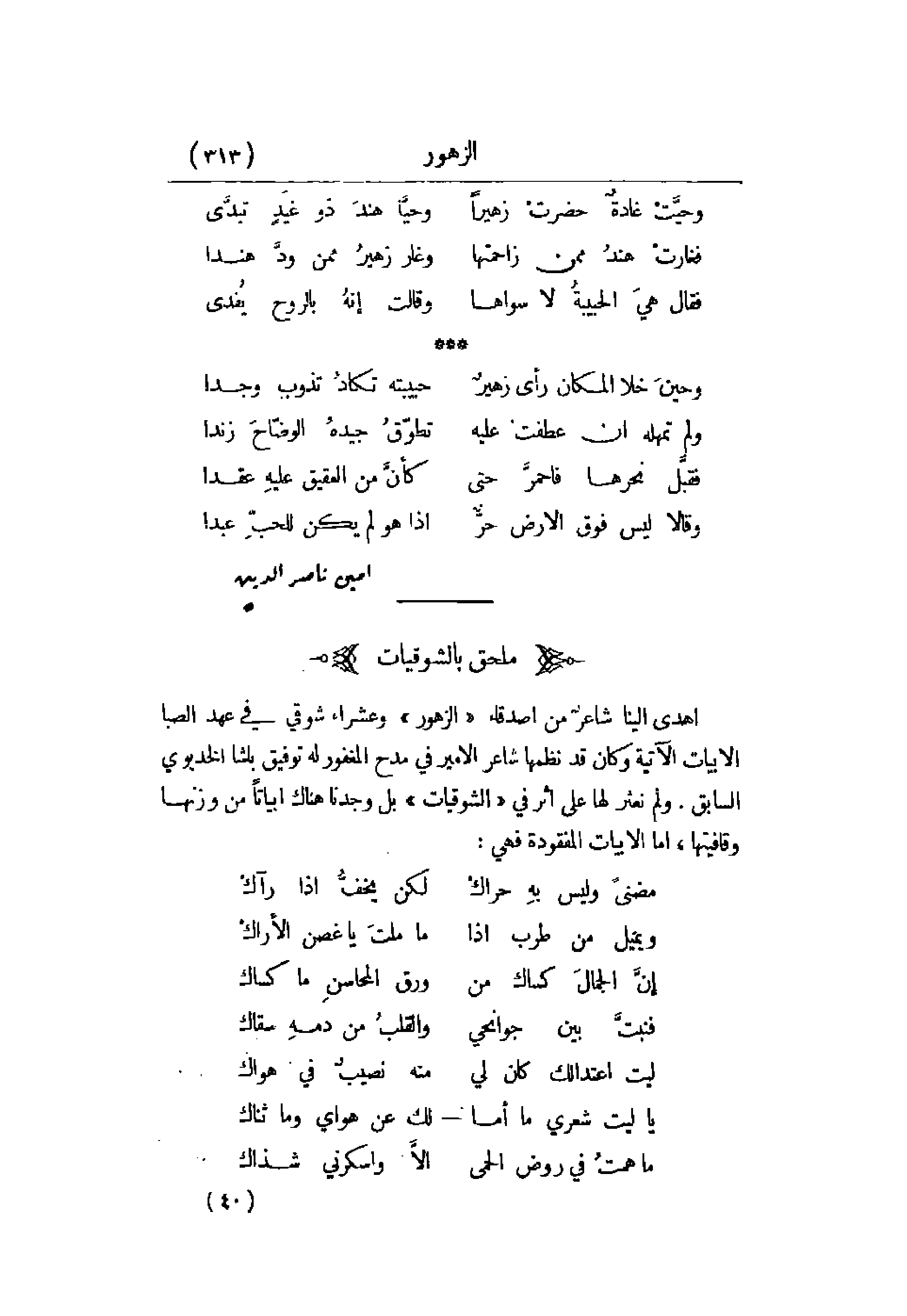 أهدى إلينا شاعر من أصدقاء الزهور وعشراء شوي في عهد الصبا الأبيات الآتية وكان قد نظمها شاعر الأمير في مدح المغفور له توفيق باشا الخديوي السابق. ولم نعثر لها على أثر في الشوقيات بل وجدنا هنا أبياتاً من وزنها وقافيتها، أما الأبيات المفقودة فهي: