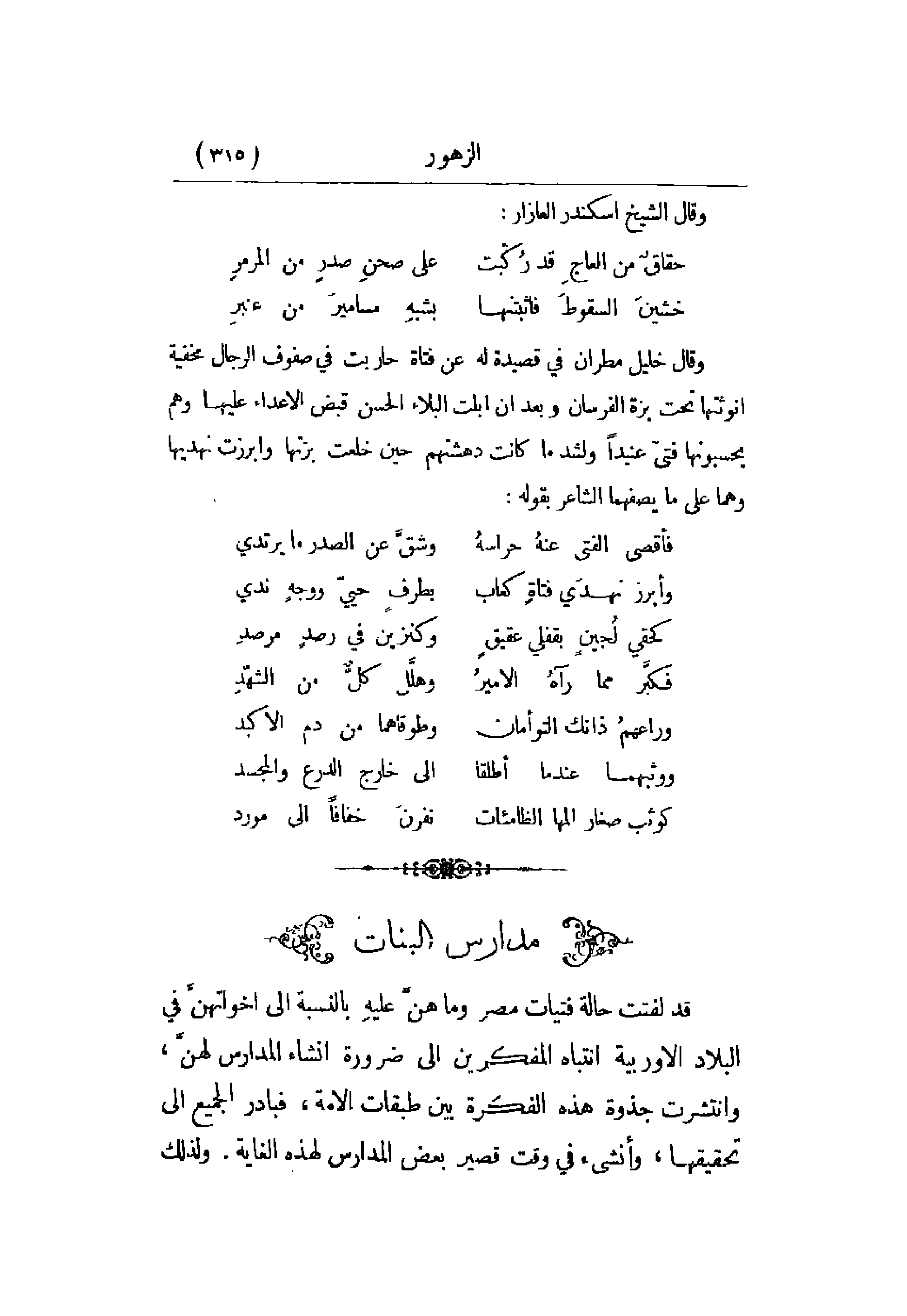 قد لفتت حالة فتيات مصر وما هن عليه بالنسبة إلى أخواتهن في البلاد الأوروبية انتباه المفكرين إلى ضرورة إنشاء المدارس لهن، وانتشرت جذوة هذه الفكرة بين طبقات الأمة، فبادر الجميع إلى تحقيقها، وأنشئ في وقت قصير بعض المدارس لهذه الغاية. ولذلك