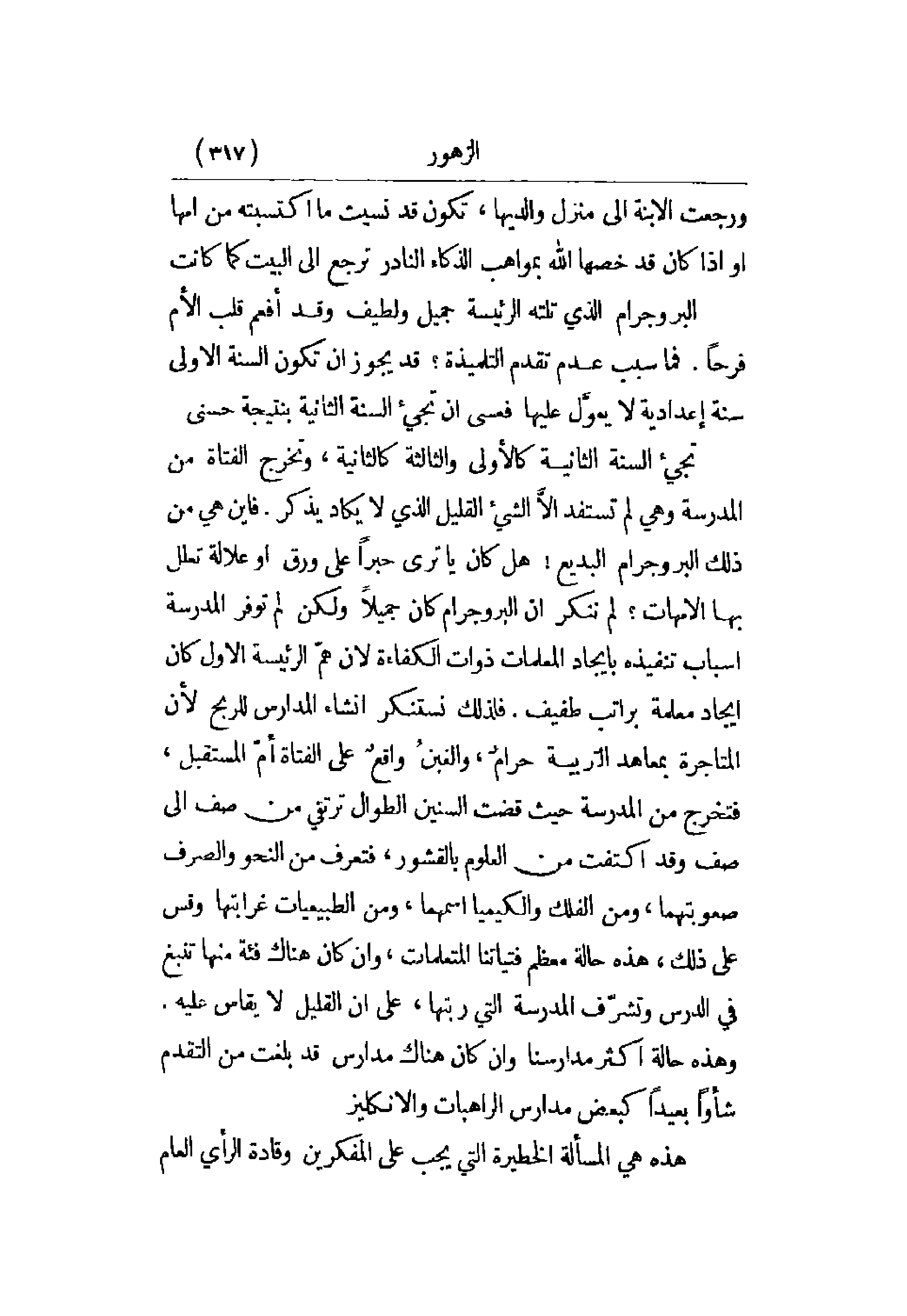 تجيء السنة الثانية كالأولى والثالثة كالثانية، وتخرج الفتاة من المدرسة وهي لم تستفد إلا الشيء القليل الذي لا يكاد يذكر. فأين هي من ذلك البروجرام البديع! هل كان يا ترى حبراً على ورق أو علالة تعلل بها الأمهات؟ لم ننكر أن البروجرام كان جميلاً ولكن لم توفر المدرسة أسباب تنفيذه بإيجاد المعلمات ذوات الكفاءة لأن هم الرئيسة الأول كان إيجاد معلمة براتب طفيف. فلذلك نستنكر إنشاء المدارس للربح لأن المتاجرة بمعاهد التربية حرام، والغبن واقع على الفتاة أم المستقبل، فتخرج من المدرسة حيث قضت السنين الطوال ترتقي من صف إلى صف وقد اكتفت من العلوم بالقشور، فتعرف من النحو والصرف صعوبتهما، ومن الفلك والكيمياء اسمهما، ومن الطبيعيات غرابتها وقس على ذلك، هذه حالة معظم فتياتنا المتعلمات، وإن كان هناك فئة منها تنبغ في الدرس وتشرف المدرسة التي ربتها، على أن القليل لا يقاس عليه. وهذه حالة أكثر مدارسنا وإن كان هناك مدارس قد بلغت من التقدم شأواً بعيداً كبعض مدارس الراهبات والإنكليز.