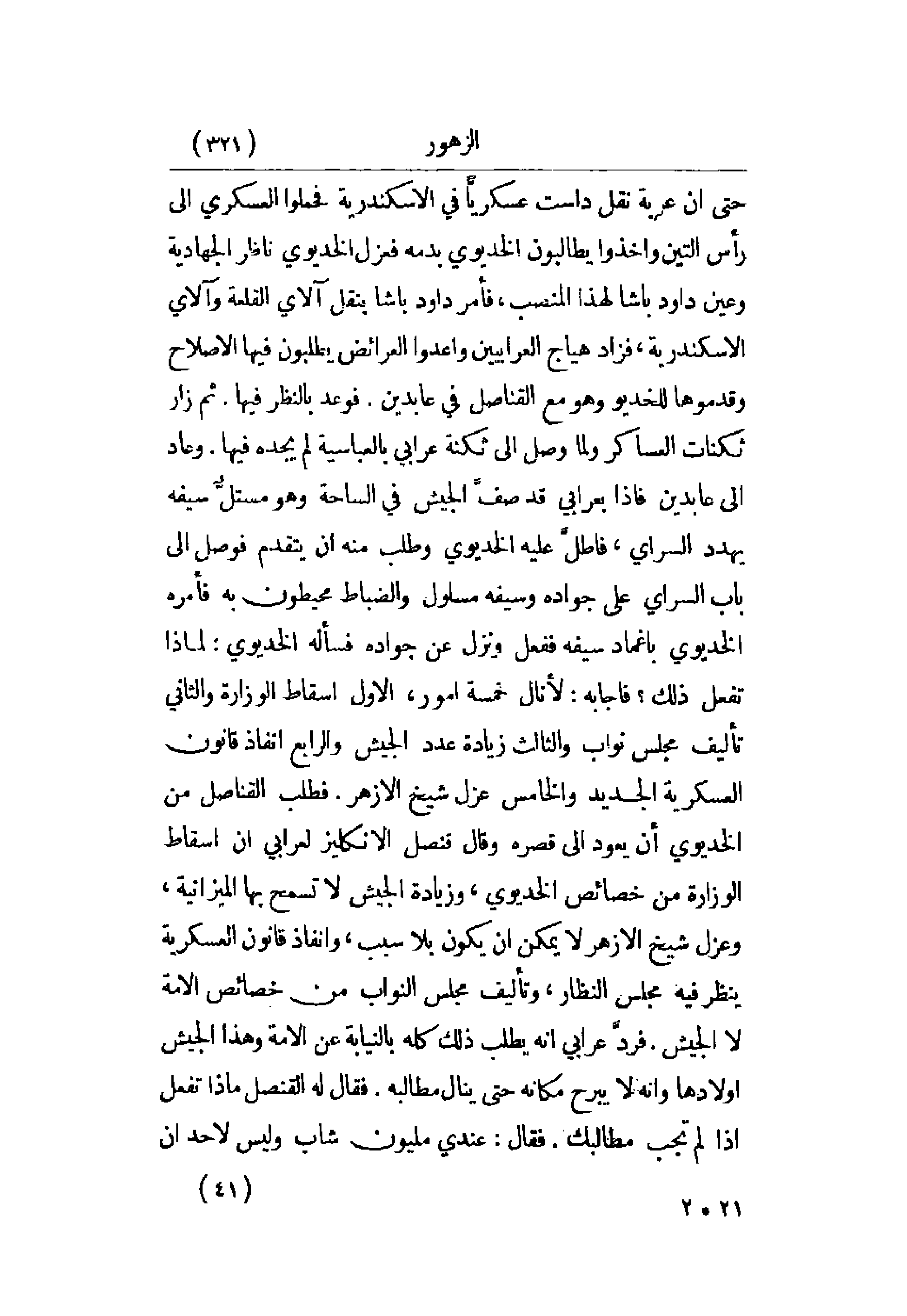 حتى أن عربة نقل داست عسكرياً في الإسكندرية فحملوا العسكرية إلى رأس التين وأخذوا يطالبون الخديوي بدمه فعزل الخديوي ناظر الجهادية وعين داود باشا لهذا المنصب، فأمر داود باشا بنقل آلاي القلعة وآلاي الإسكندرية، فزاد هياج العرابيين وأعدوا العرائض يطلبون فيها الإصلاح وقدموها للخديوي وهو مع القناصل في عابدين. فوعد بالنظر فيها. ثم زار ثكنات العساكر ولما وصل إلى ثكنة عرابي بالعباسية لم يجده فيها. وعاد إلى عابدين فإذا بعرابي قد صف الجيش في الساحة وهو مستل سيفه يهدد السراي، فأطل عليه الخديوي وطلب منه أن يتقدم فوصل إلى باب السراي على جواده وسيف مسلول والضباط محيطون به فأمره الخديوي بإغماد سيفه ففعل ونزل عن جواده فسأله الخديوي: لماذا تفعل ذلك؟ فأجابه: لأنال خمسة أمور، الأول إسقاط الوزارة والثاني تأليف مجلس نواب والثالث زيادة عدد الجيش والرابع إنفاذ قانون العسكرية الجديد والخامس عزل شيخ الأزهر. فطلب القناصل من الخديوي أن يعود إلى قصره وقال قنصل الإنكليز لعرابي إن إسقاط الوزارة من خصائص الخديوي، وزيادة الجيش لا تسمح بها الميزانية، وعزل شيخ الأزهر لا يمكن أن يكون بلا سبب، وإنفاذ قانون العسكرية ينظر فيه مجلس النظار، وتأليف مجلس النواب من خصائص الأمة لا الجيش. فرد عرابي أنه يطلب ذلك كله بالنيابة عن الأمة وهذا الجيش أولادها وأنه لا يبرح مكانه حتى ينال مطالبه. فقال له القنصل ماذا تفعل إذا لم تجب مطالبك. فقال: عندي مليون شاب وليس لأحد أن