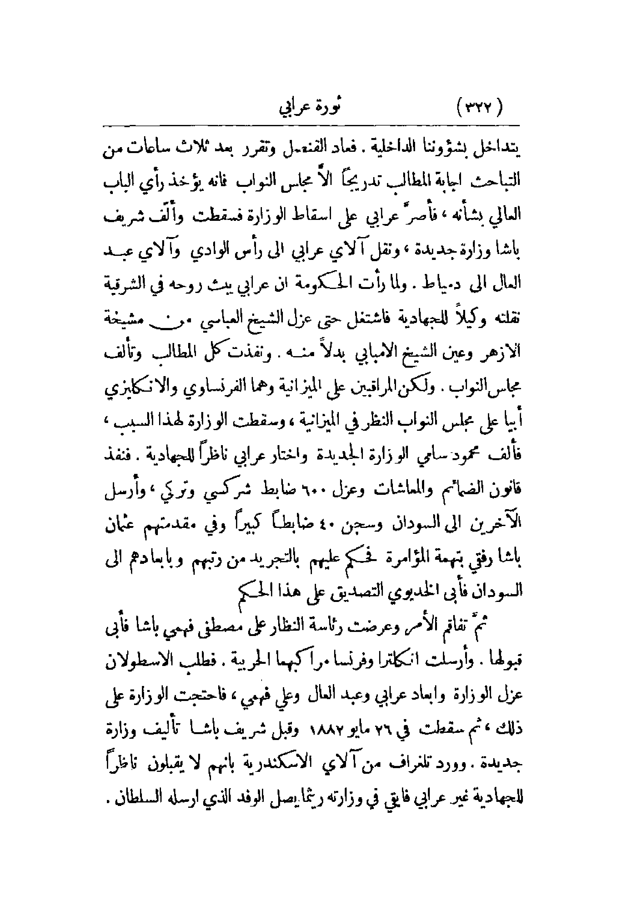 فأصر عرابي على إسقاط الوزارة فسقطت وألف شريف باشا وزارة جديدة، ونقل آلاي عرابي إلى رأس الوادي وآلاي عبد العالي إلى دمياط. ولما رأت الحكومة أن عرابي يبث روحه في الشرقية نقلته وكيلاً للجهادية فاشتغل حتى عزل الشيخ العباسي من مشيخة الأزهر وعين الشيخ الإمبابي بدلاً منه. ونفذت كل المطالب وتألف مجلس النواب. ولكن المراقبين على الميزانية وهما الفرنساوي والإنكليزي أبيا على مجلس النواب النظر في الميزانية، وسقطت الوزارة لهذا السبب، فألف محمود سامي الوزارة الجديدة واختار عرابي ناظراً للجهادية. فنفذ قانون الضمائم والمعاشات وعزل 600 ضابط شركسي وتركي، وأرسل الآخرين إلى السودان وسجن 40 ضابطاً كبيراً وفي مقدمتهم عثمان باشا رفقي بتهمة المؤامرة فحكم عليهم بالتجريد من رتبهم وبإبعادهم إلى السودان فأبى الخديوي التصديق على هذا الحكم.