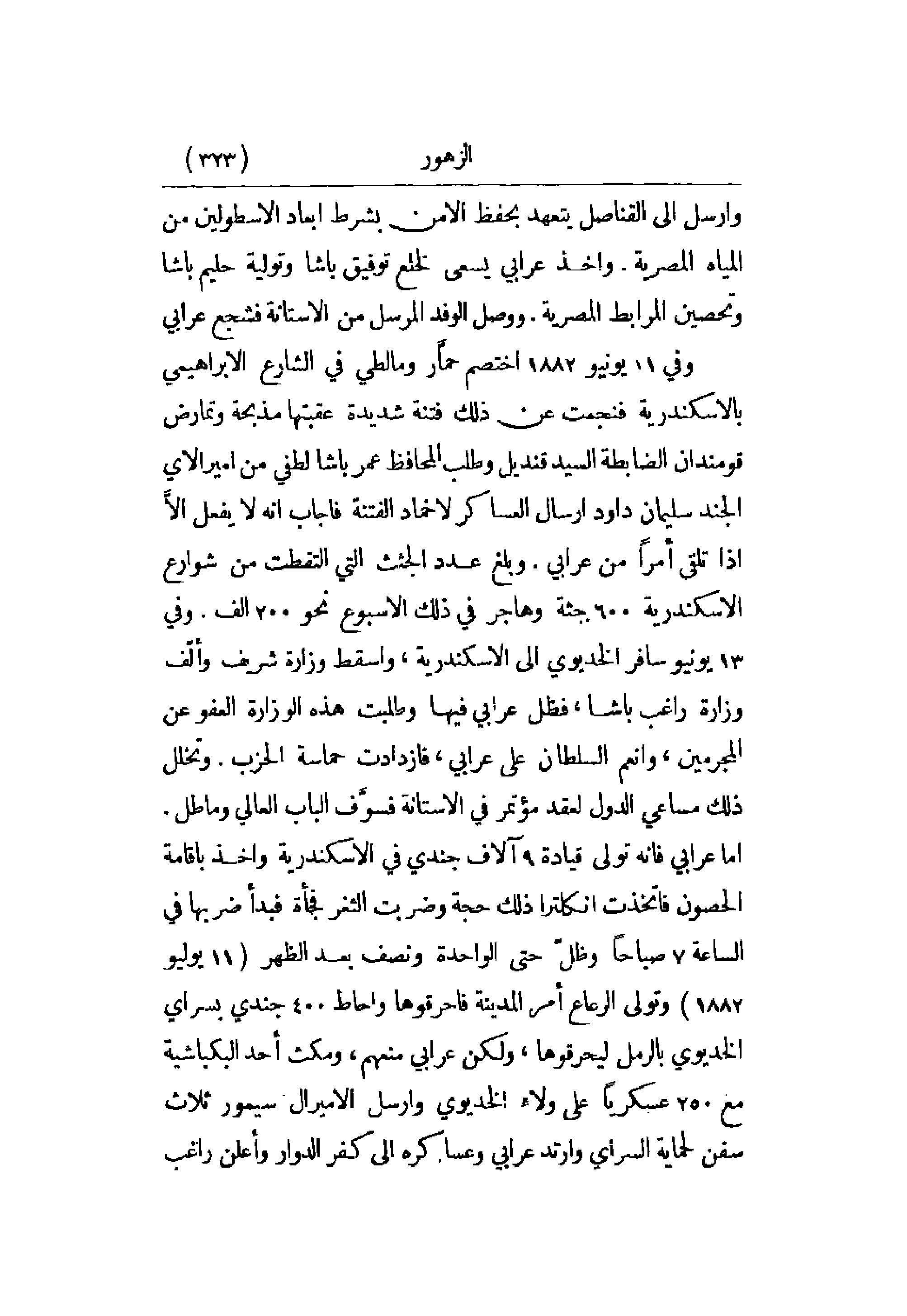 ذلك مساعي الدول لعقد مؤتمر في الأستانة فسوّف الباب العالي وماطل. أما عرابي فإنه تولى قيادة 9 آلاف جندي في الإسكندرية وأخذ بإقامة الحصون فاتخذت إنكلترا ذلك حجة وضربت الثغر فجأة فبدأ ضربها في الساعة 7 صباحاً وظل حتى الواحدة والنصف بعد الظهر (11 يوليو 1882) وتولى الرعاع أمر المدينة فأحرقوها وأحاط 400 جندي بسراي الخديوي بالرمل ليحرقوها، ولكن عرابي منعهم، ومكث أحد البكباشية مع 250 عسكرياً على ولاء الخديوي وأرسل الأميرال سيمور ثلاث سفن لحماية السراي وارتد عرابي وعساكره إلى كفر الدوار وأعلن راغب