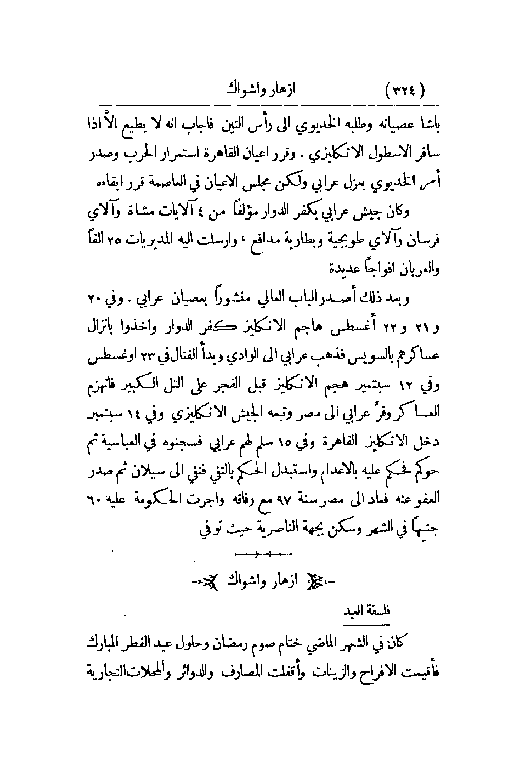 وبعد ذلك أصدر الباب العالي منشوراً بعصيان عرابي. وفي 20 و21 و22 أغسطس هاجم الإنكليز كفر الدوار وأخذوا بإنزال عساكرهم بالسويس فذهب عرابي إلى الوادي وبدأ القتال في 23 أوغسطس وفي 12 سبتمبر هجم الإنكليز قبل الفجر على التل الكبير فانهزم العساكر وفر عرابي إلى مصر وتبعه الجيش الإنكليزي وفي 14 سبتمبر دخل الإنكليز القاهرة وفي 15 سلم لهم عرابي فسجنوه في العباسية ثم حوكم فحكم عليه بالإعدام واستبدل الحكم بالنفي فنفي إلى سيلان ثم صدر العفو عنه فعاد إلى مصر سنة 97 مع رفاقه وأجرت الحكومة عليه 60 جنيهاً في الشهر وسكن بجهة الناصرية حيث توفي.