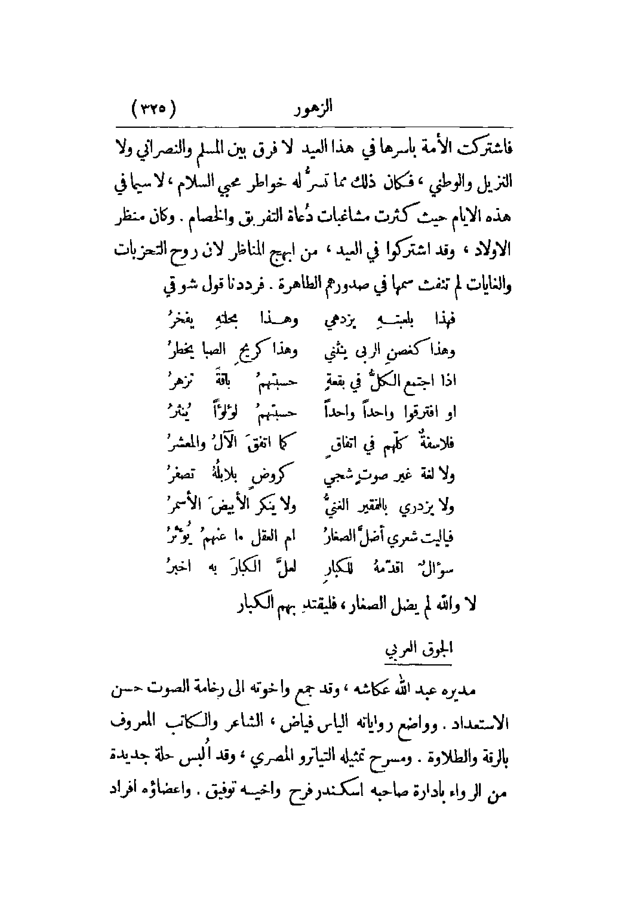 فاشتركت الأمة بأسرها في هذا العيد لا فرق بين المسلم والنصراني ولا النزيل والوطني، فكان ذلك مما تسر له خواطر محبي السلام، لاسيما في هذه الأيام حيث كثرت مشاغبات دعاة التفريق والخصام. وكان منظر الأولاد، وقد اشتركوا في العيد، من أبهج المناظر لأن روح التحزبات والغايات لم تنفث سمها في صدورهم الطاهرة. فرددنا قول شوقي: