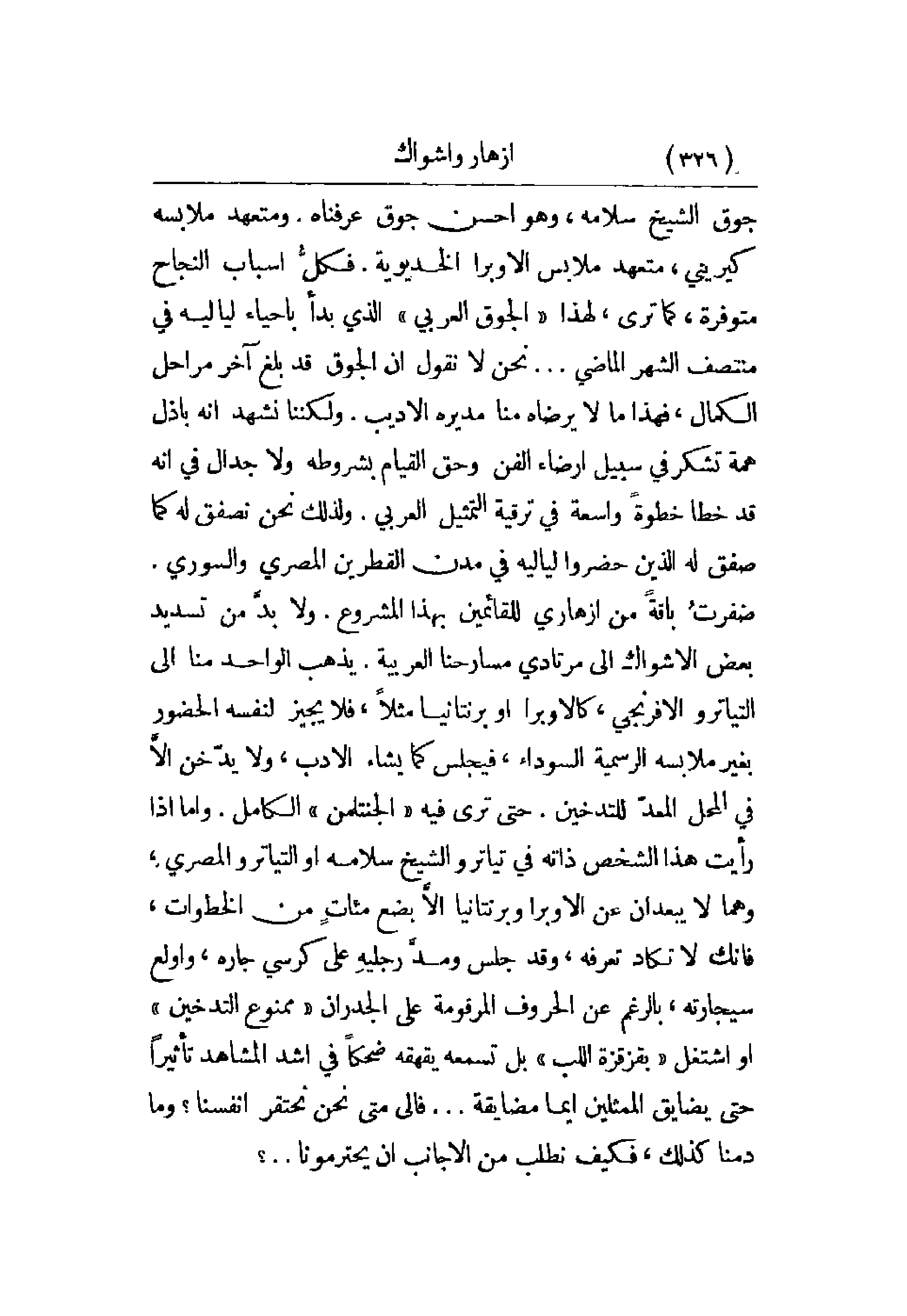 آخر مراحل الكمال، فهذا ما لا يراضه منا مديره الأديب. ولكننا نشهد أنه باذل همة تشكر في سبيل إرضاء الفن وحق القيام بشروطه ولا جدال في أنه قد خطا خطوة واسعة في ترقية التمثيل العربي. ولذلك نحن نصفق له كما صفق له الذين حضروا لياليه في مدن القطرين المصري والسوري. ضفرت باقة من أزهاري للقائمين بهذا المشروع. ولابد من تسديد بعض الأشواك إلى مرتادي مسارحنا العربية. يذهب الواحد منا إلى التياترو الإفرنجي، كالأوبرا او برنتانيسا مثلاً، فلا يجيز لنفسه الحضور بغير ملابسه الرسمية السوداء، فيجلس كما يشاء الأدب، ولا يدخن إلا في المجل المعد للتدخي. حتى ترى فيه الجنتلمن الكامل. وأما إذا رأيت هذا الشخص ذاته في تياترو الشيخ سلامة أو التيارو المصري، وهما لا يبعدان عن الأوبرا وبرنتانيا إلا بضع مئات من الخطوات، فإنك لا تكاد تعرفه، وقد جلس ومد رجليه على كرسي جاره، وأولع سيجارته، بالرغم من الحروف المرقومة على الجدران ممنوع التدخين أو اشتغل بقزقزة اللب بل تسمعه يقهقه ضحكاً في أشد المشاهد تأثيراً حتى يضايق الممثلين أيما مضايقة. . . فإلى متى نحن نحتقر أنفسنا؟ وما دمنا كذلك، فكيف نطلب من الأجانب أن يحترمونا. . .