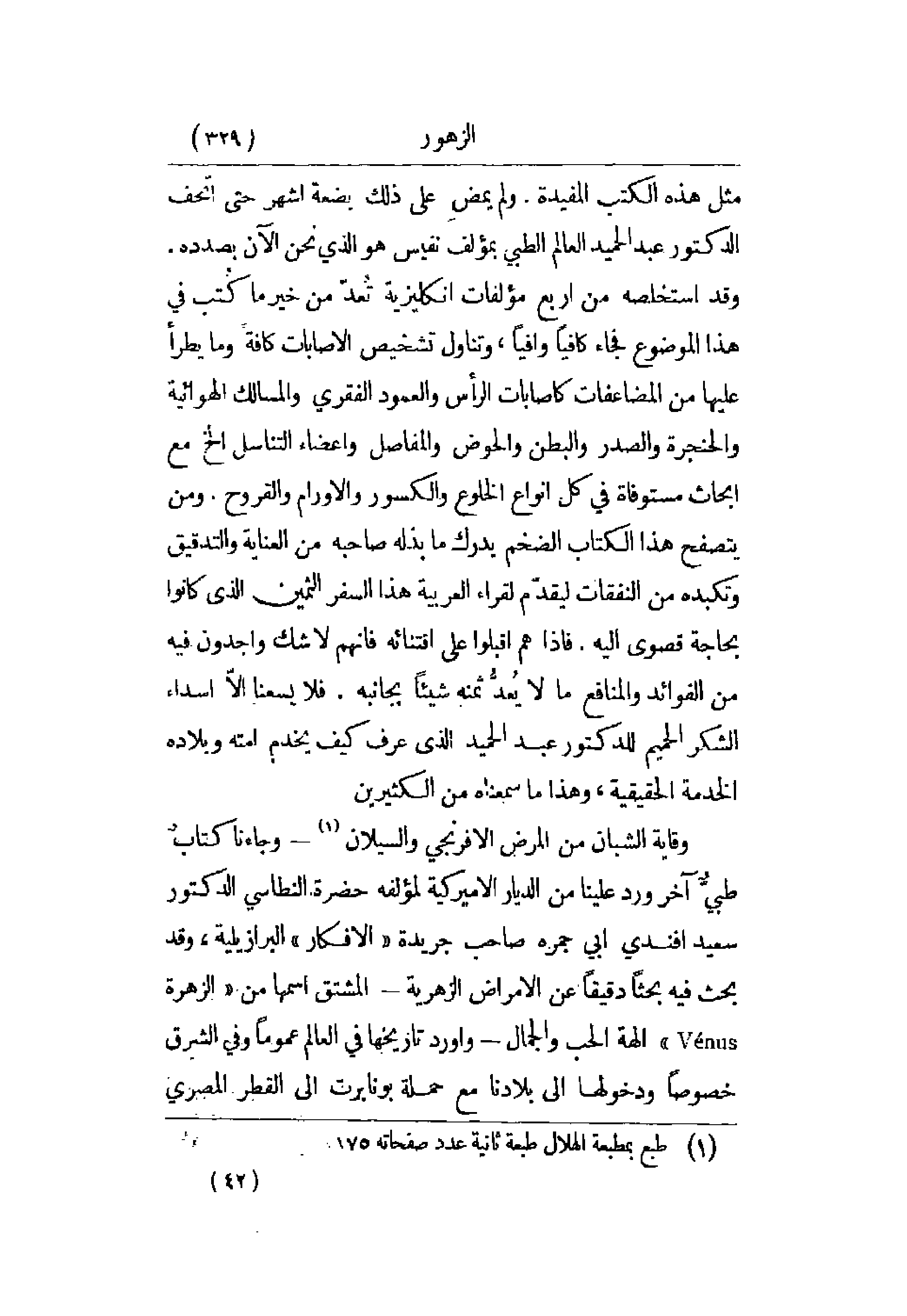 وقاية الشبان من المرض الإفرنجي والسيلان - وجاءنا كتاب طبي آخر ورد علينا من الديار الأمريكية لمؤلفه حضرة النطاسي الدكتور سعيد أفندي أبي جمره صاحب جريدة الأفكار البرازيلية، وقد بحث فيه بحثاً دقيقاً عن الأمراض الزهرية - المشتق اسمها من الزهرة آلهة الحب والجمال - وأورد تاريخها في العالم عموماً وفي الشرق خصوصاً ودخولها إلى بلادنا مع حملة بونابرت إلى القطر المصري