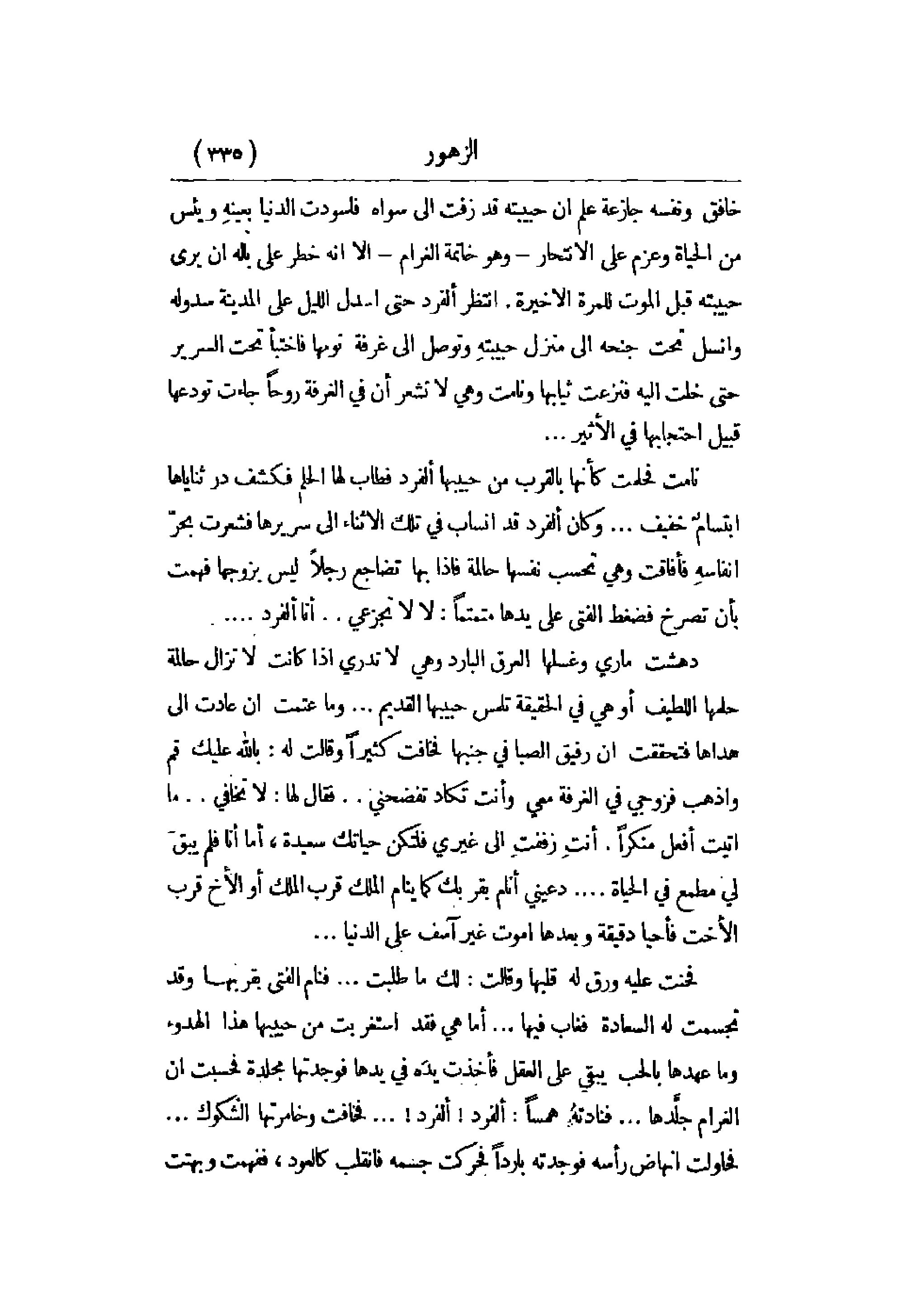 دهشت ماري وغسلها العرق البارد وهي لا تدري إذا كانت لا تزال حالمة حلمها اللطيف أو هي في الحقيقة تلمس حبيبها القديم. . . وما عتمت أن عادت إلى هداها فتحققت أن رفيق الصبا في جنبها فخافت كثيراً وقالت له: بالله عليه قم واذهب فزوجي في الغرفة معي وأنت تكاد تفضحني. . . فقال لها: لا تخافي. . . ما أتيت أفعل منكراً. أنت زففت إلى غيري فلتكن حياتك سعيدة، أما أنا فلم يبق لي مطمع في الحياة. . . دعيني أنام بقربك كما ينام الملك قرب الملك أو الأخ قرب الأخت فأحيا دقيقة وبعدها أموت غير آسف على الدنيا. . .