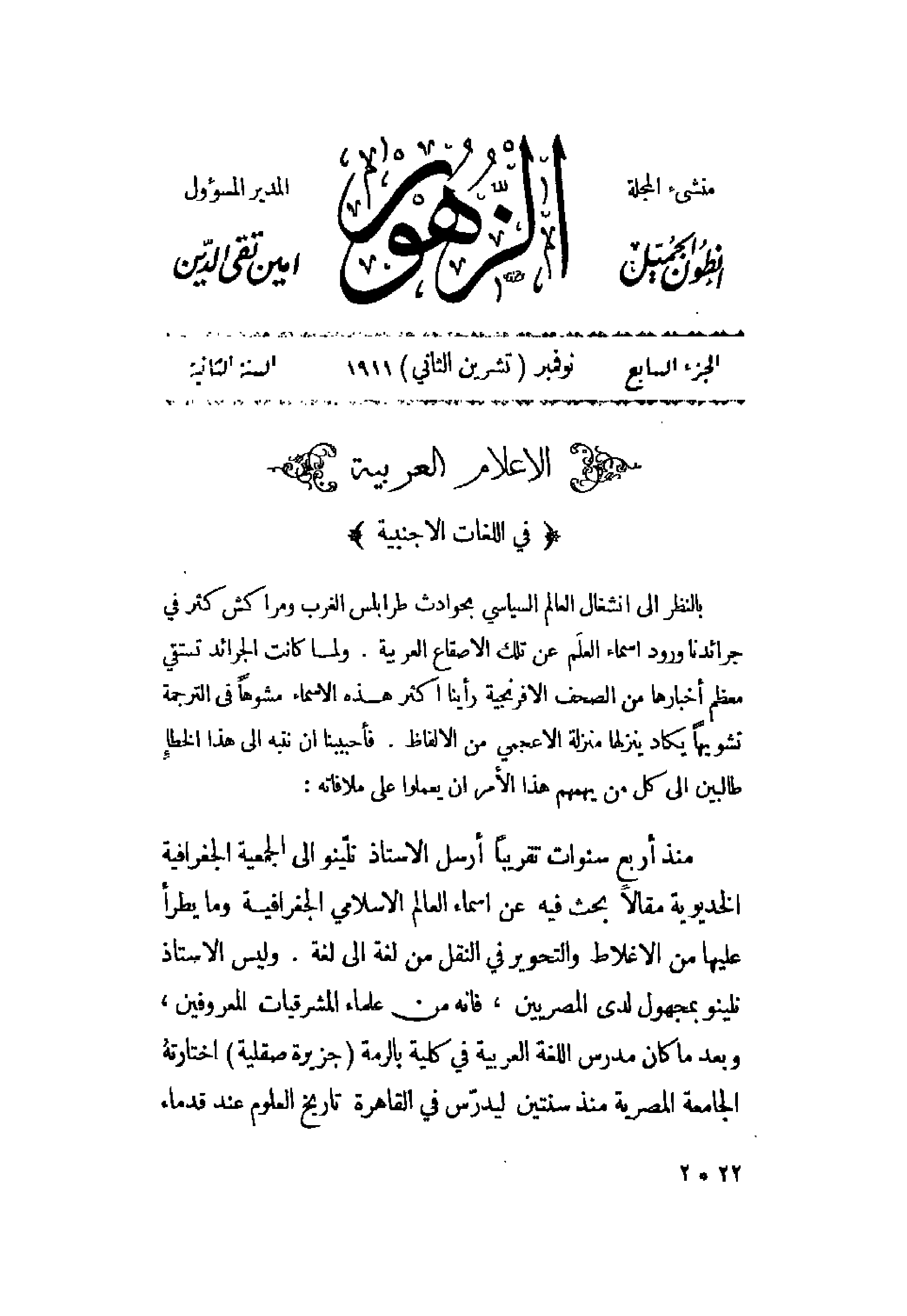 بالنظر إلى انشغال العالم السياسي بحوادث طرابلس الغرب ومراكش كثر في جرائدنا ورود أسماء العلم عن تلك الأصقاع العربية. ولما كانت الجرائد تستقي معظم أخبارها من الصحف الإفرنجية رأينا أكثر هذه الأسماء مشوهاً في الترجمة تشويهاً يكاد ينزلها منزلة الأعجمي من الألفاظ. فأحببنا أن ننبه إلى هذا الخطأ طالبين إلى كل من يهمهم هذا الأمر أن يعملوا على ملاقاته: